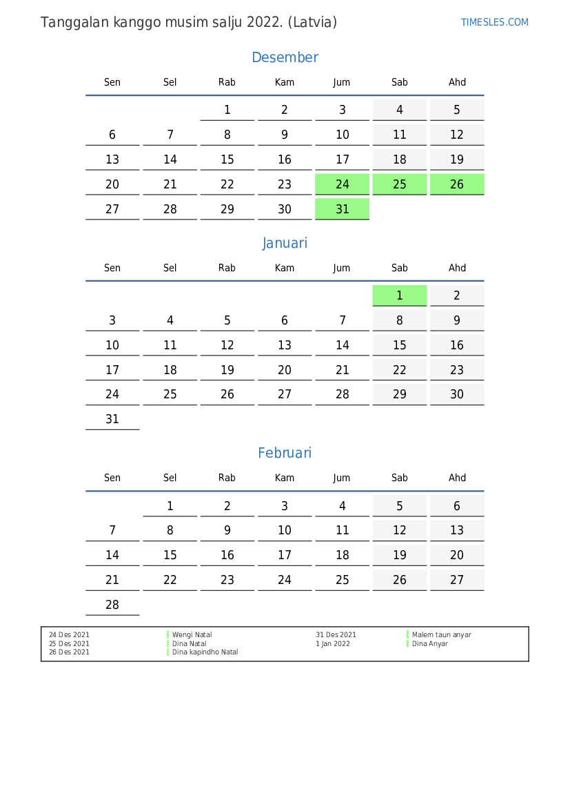 Download lan nyithak tanggalan PDF kanthi preinan lan akhir minggu kanggo musim salju taun 2022 kanggo Latvia