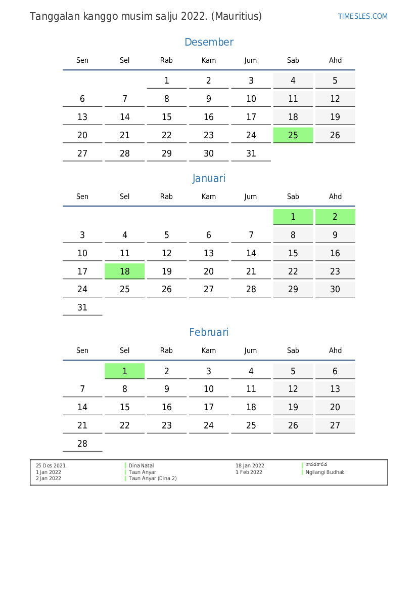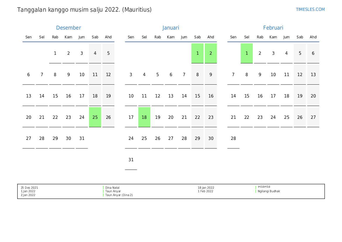 Download lan nyithak tanggalan PDF kanthi preinan lan akhir minggu kanggo musim salju taun 2022 kanggo Mauritius