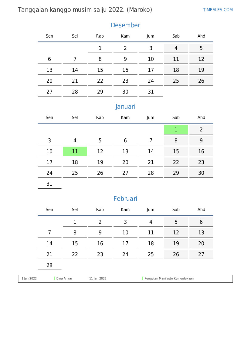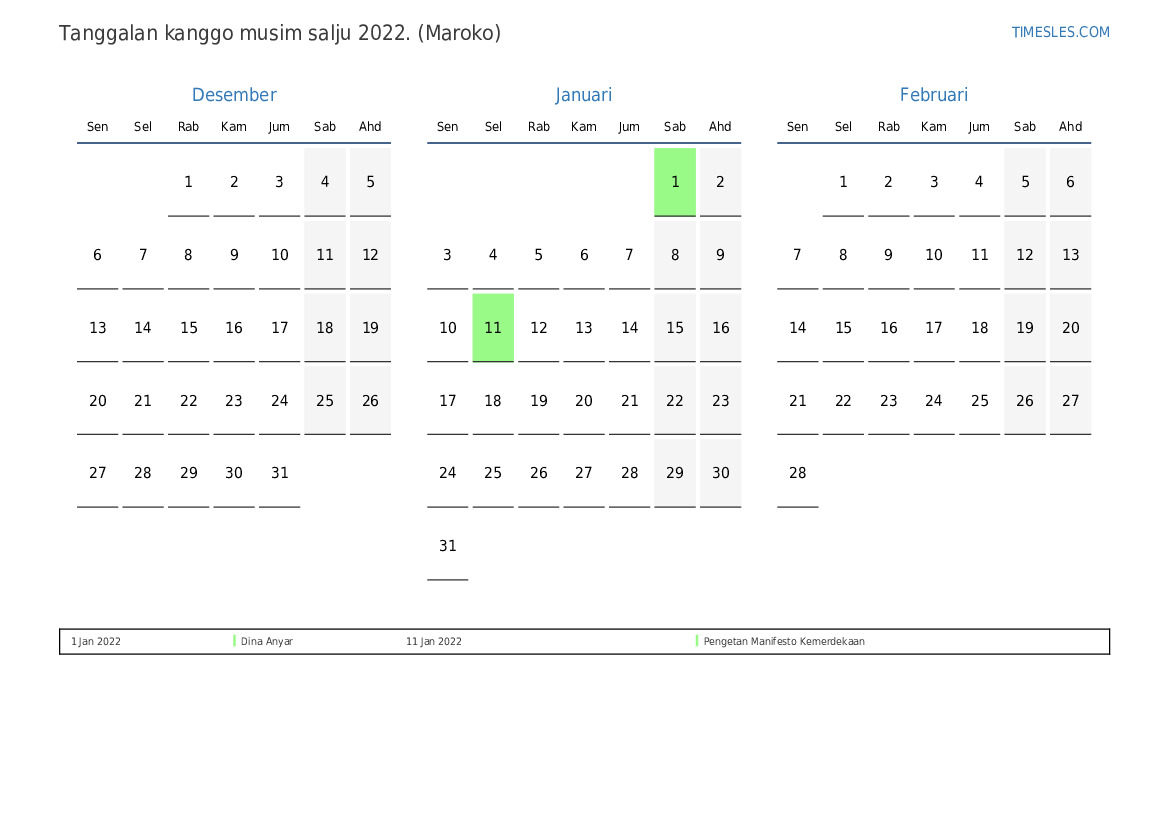 Download lan nyithak tanggalan PDF kanthi preinan lan akhir minggu kanggo musim salju taun 2022 kanggo Maroko