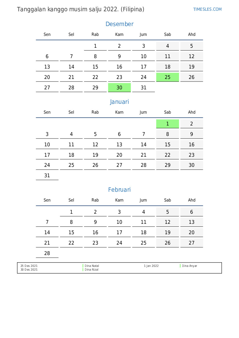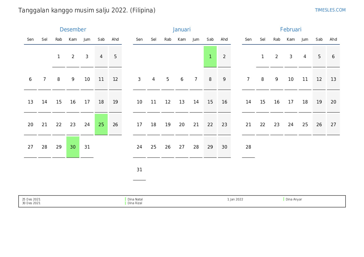Download lan nyithak tanggalan PDF kanthi preinan lan akhir minggu kanggo musim salju taun 2022 kanggo Filipina