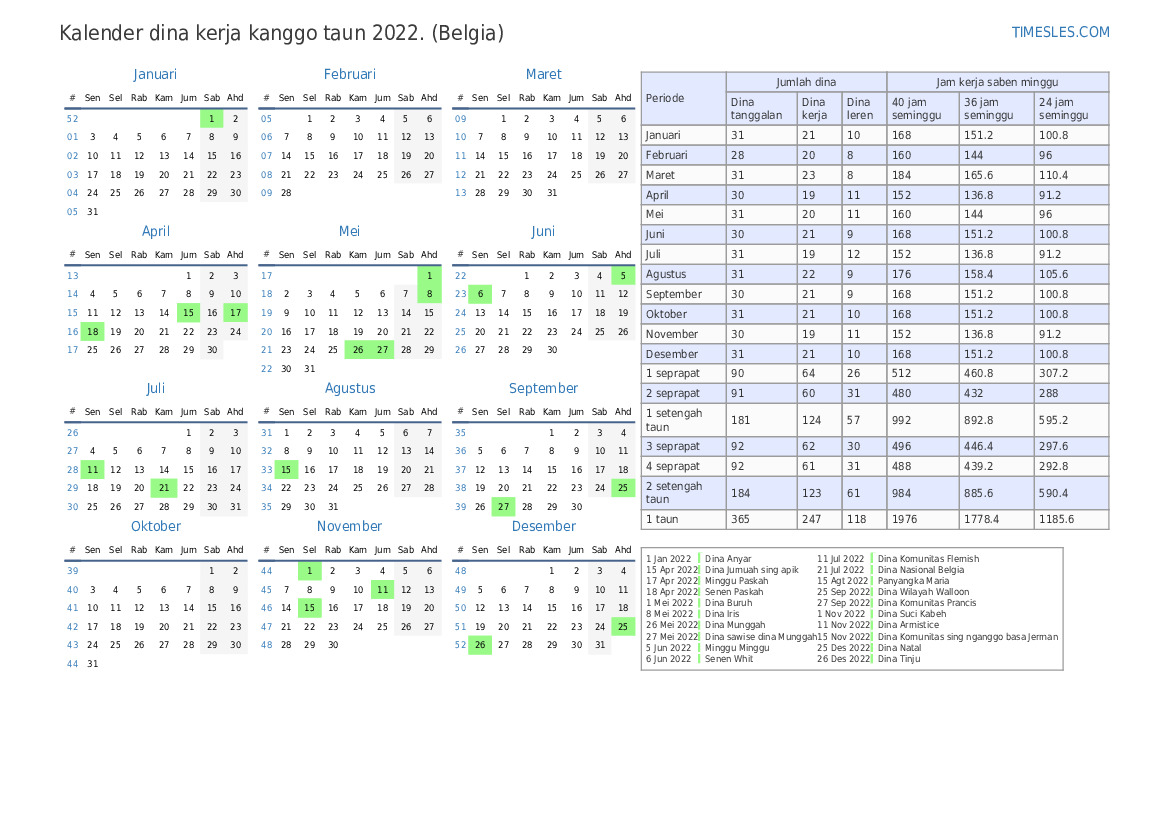 Dina kerja kanggo Desember 2022 kanggo Belgia