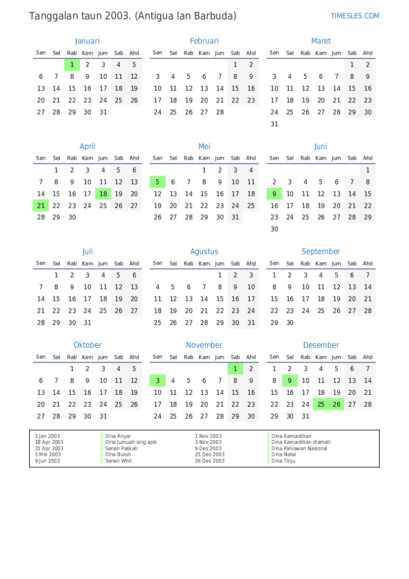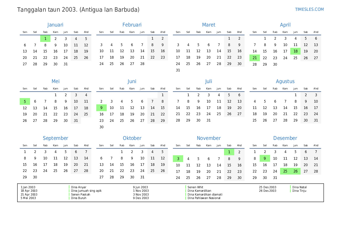 Download lan nyithak tanggalan PDF kanthi preinan lan akhir minggu kanggo taun 2003 kanggo Antigua lan Barbuda