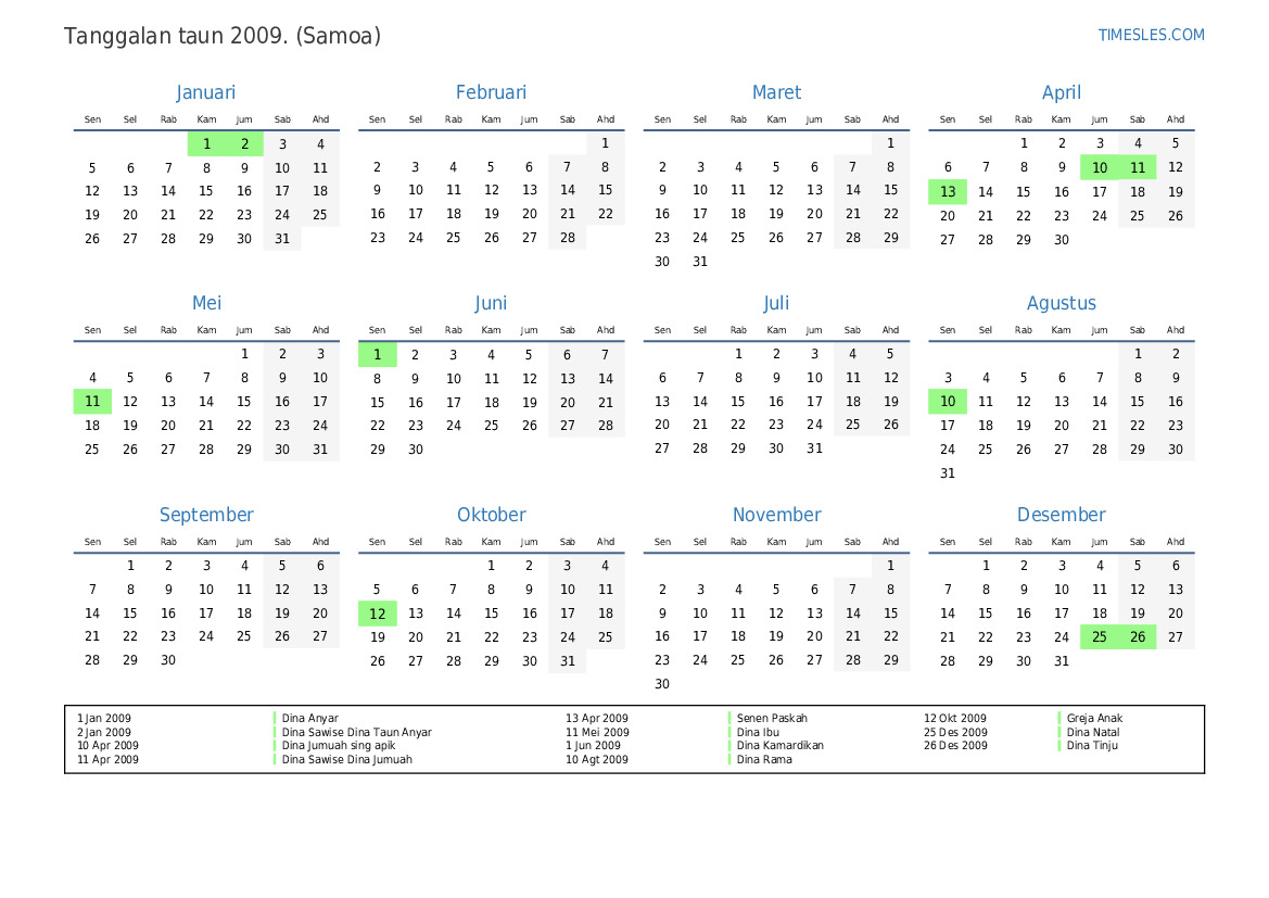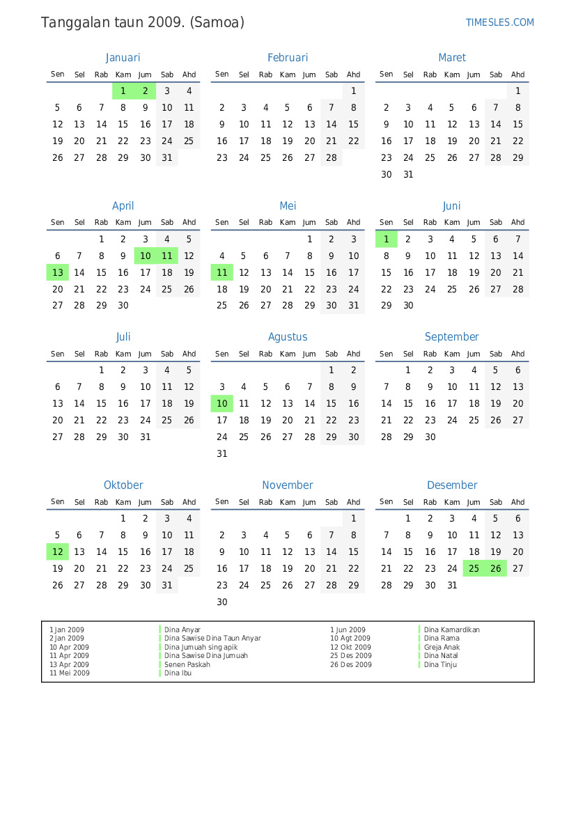 Download lan nyithak tanggalan PDF kanthi preinan lan akhir minggu kanggo taun 2009 kanggo Samoa