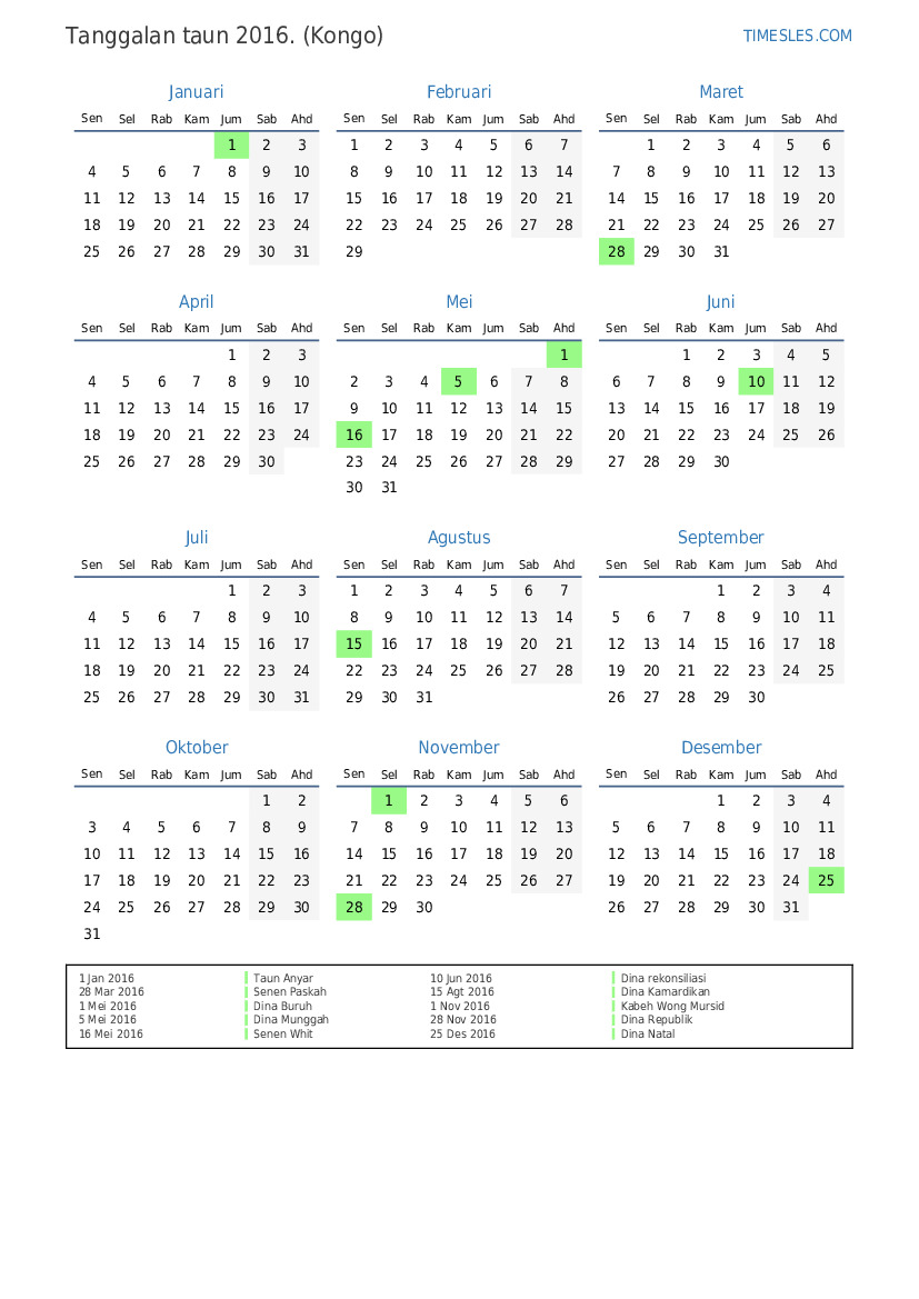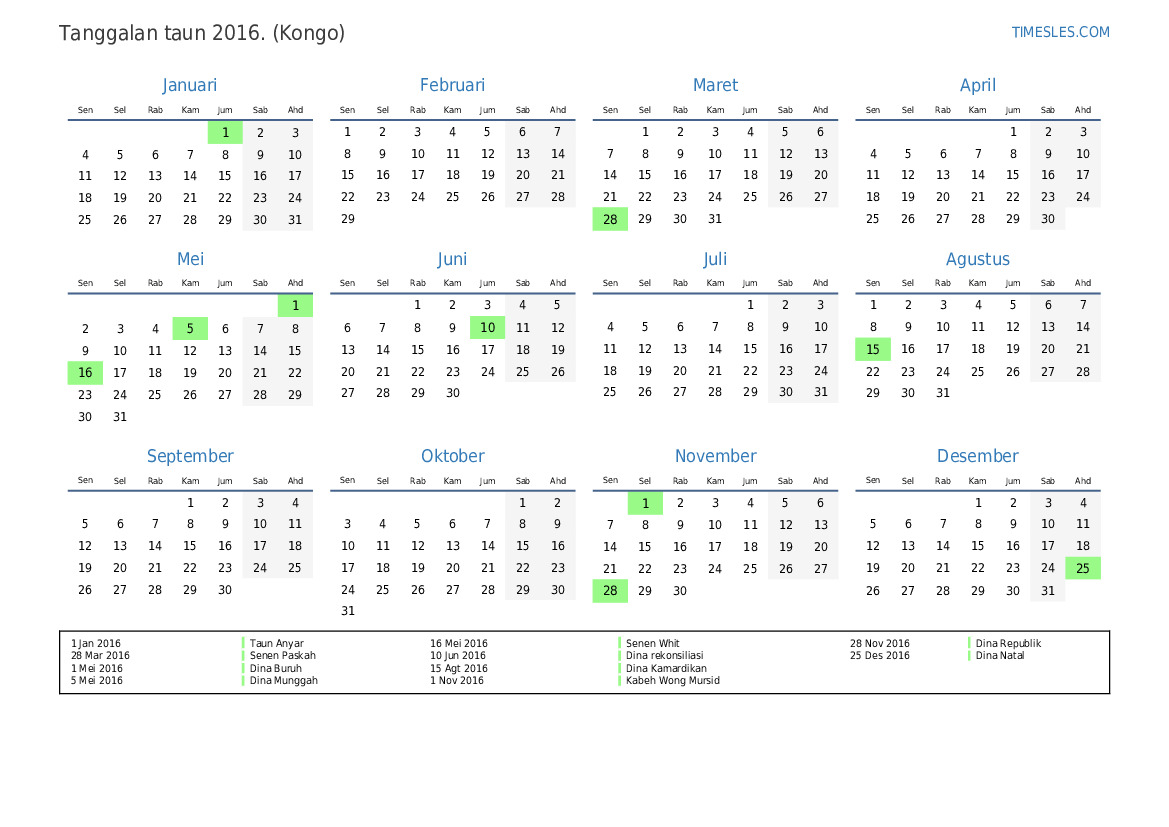 Download lan nyithak tanggalan PDF kanthi preinan lan akhir minggu kanggo taun 2016 kanggo Kongo