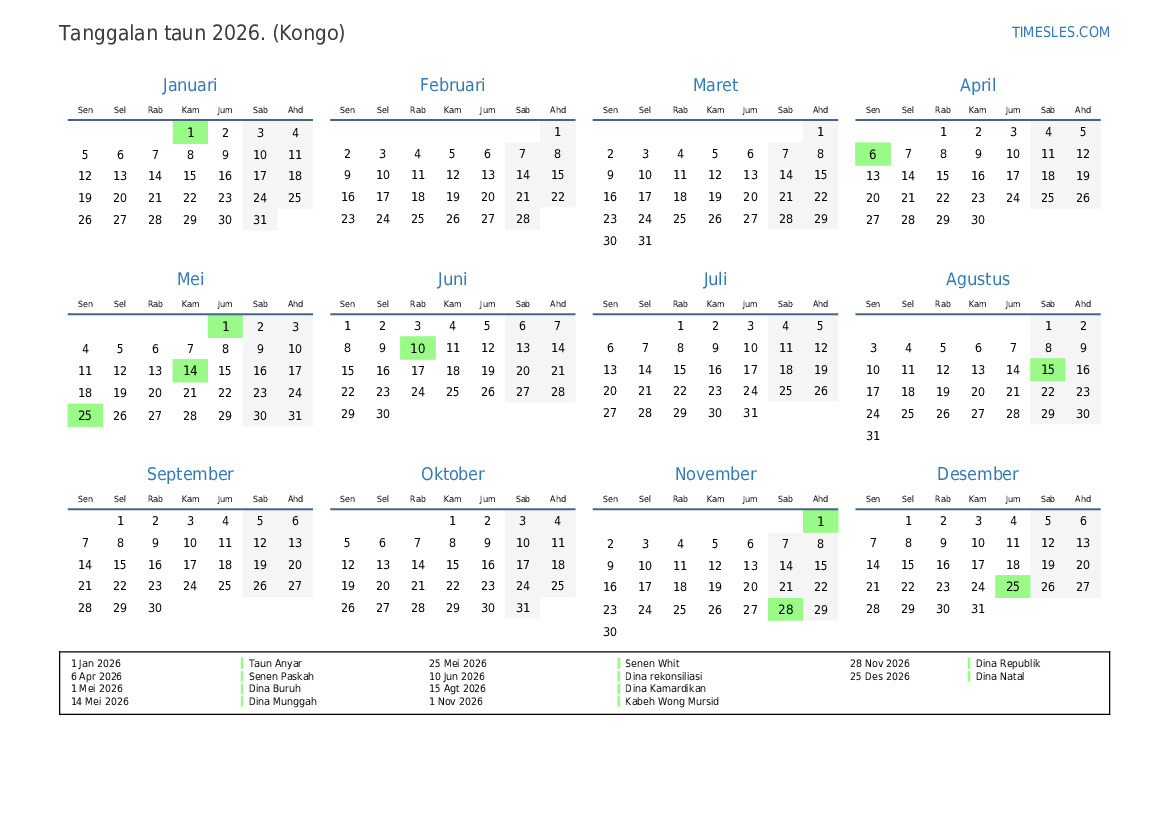 Download lan nyithak tanggalan PDF kanthi preinan lan akhir minggu kanggo taun 2026 kanggo Kongo