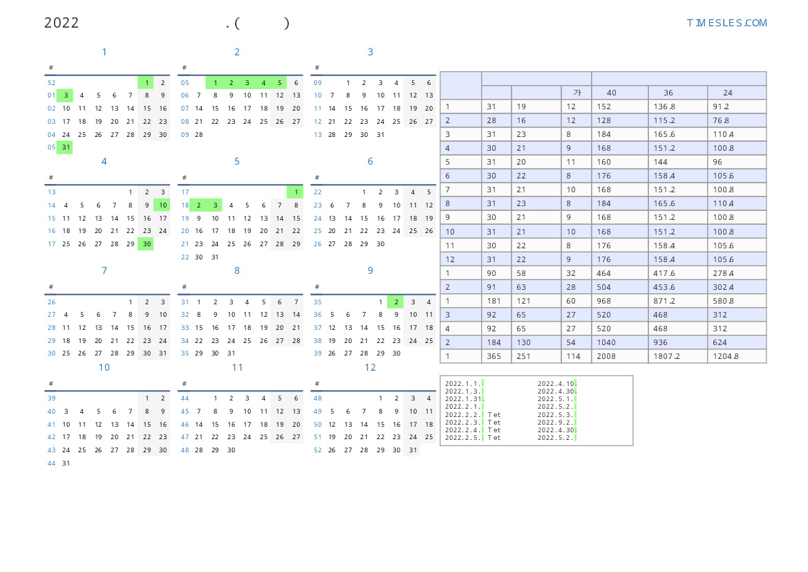 베트남 2022 년 1 분기 공휴일 및 주말이 포함 된 PDF 영업일 캘린더 다운로드 및 인쇄