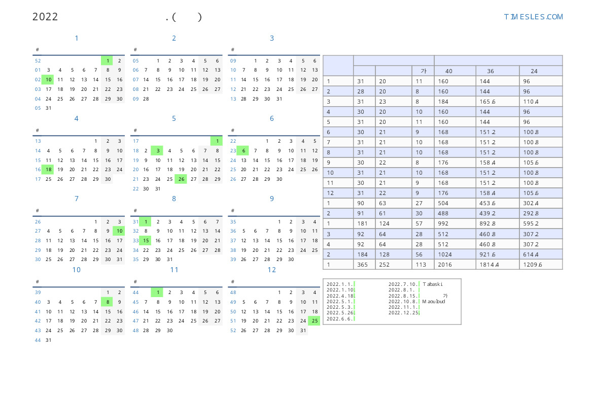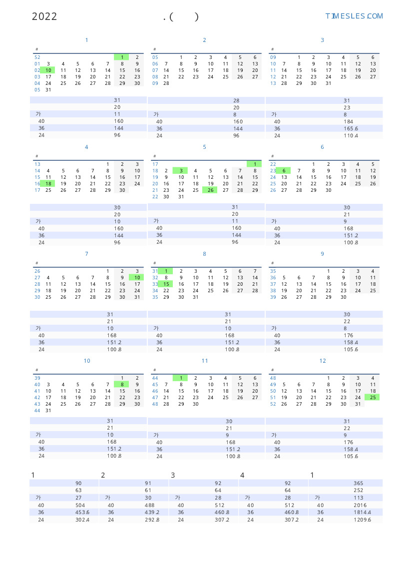 베냉 2022 년 2 분기 휴일 및 주말이 포함 된 영업일 달력