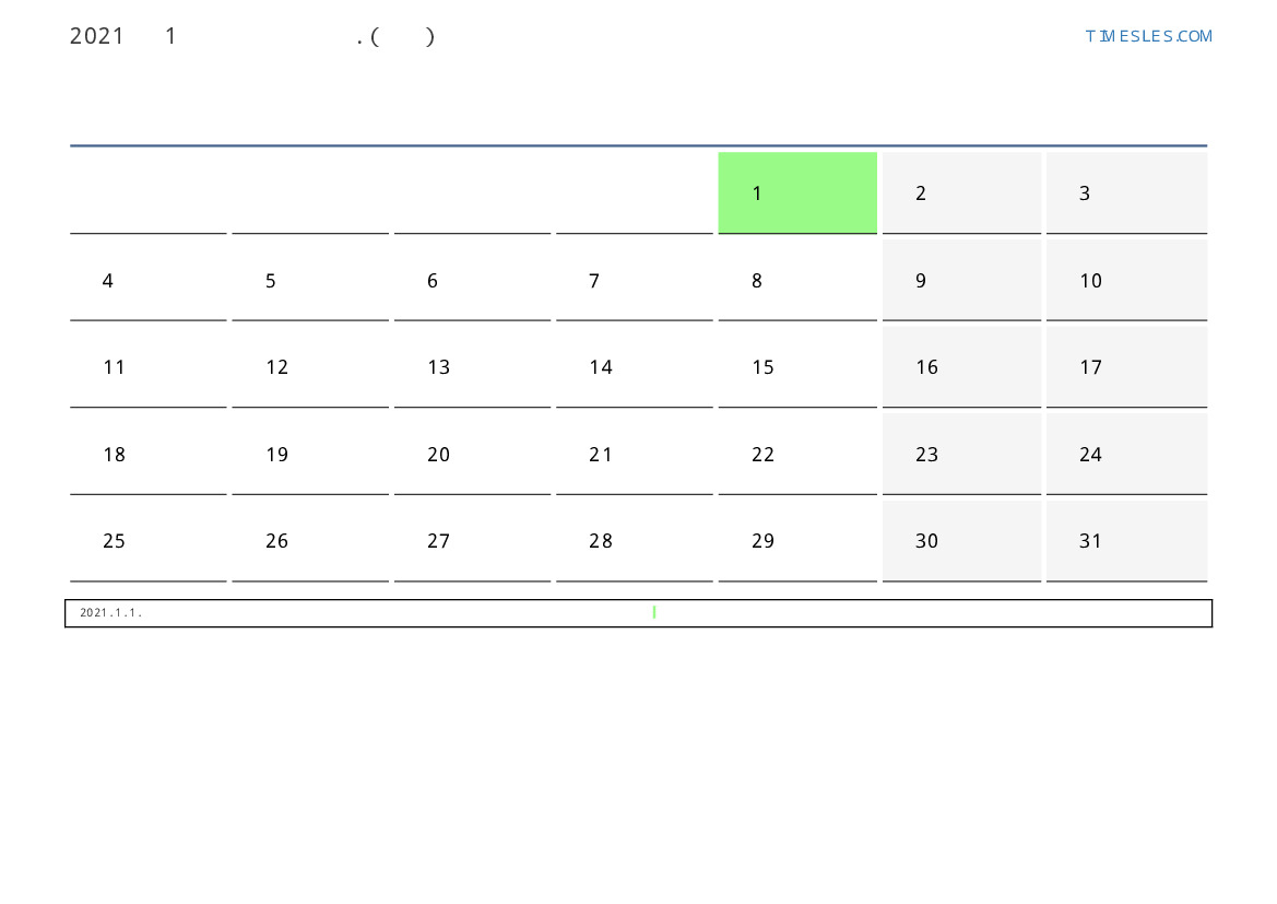 1월에는 31 일 포함됩니다. 이것은 2021 년 1 개월입니다. 올해의 계절 : 겨울. 1월 금요일에 시작하여 일요일에 끝납니다. 2021년 1월에 콩고 1 공휴일 및 휴무 있습니다.
