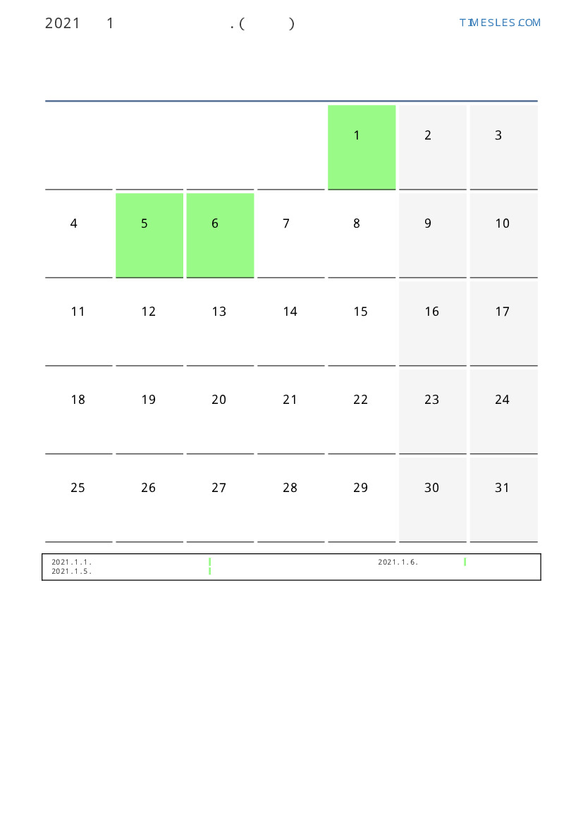 1월에는 31 일 포함됩니다. 이것은 2021 년 1 개월입니다. 올해의 계절 : 겨울. 1월 금요일에 시작하여 일요일에 끝납니다. 2021년 1월에 스웨덴 3 공휴일 및 휴무 있습니다.