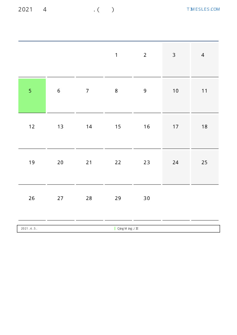 중국 2021 년 4월 월 공휴일 및 주말 달력