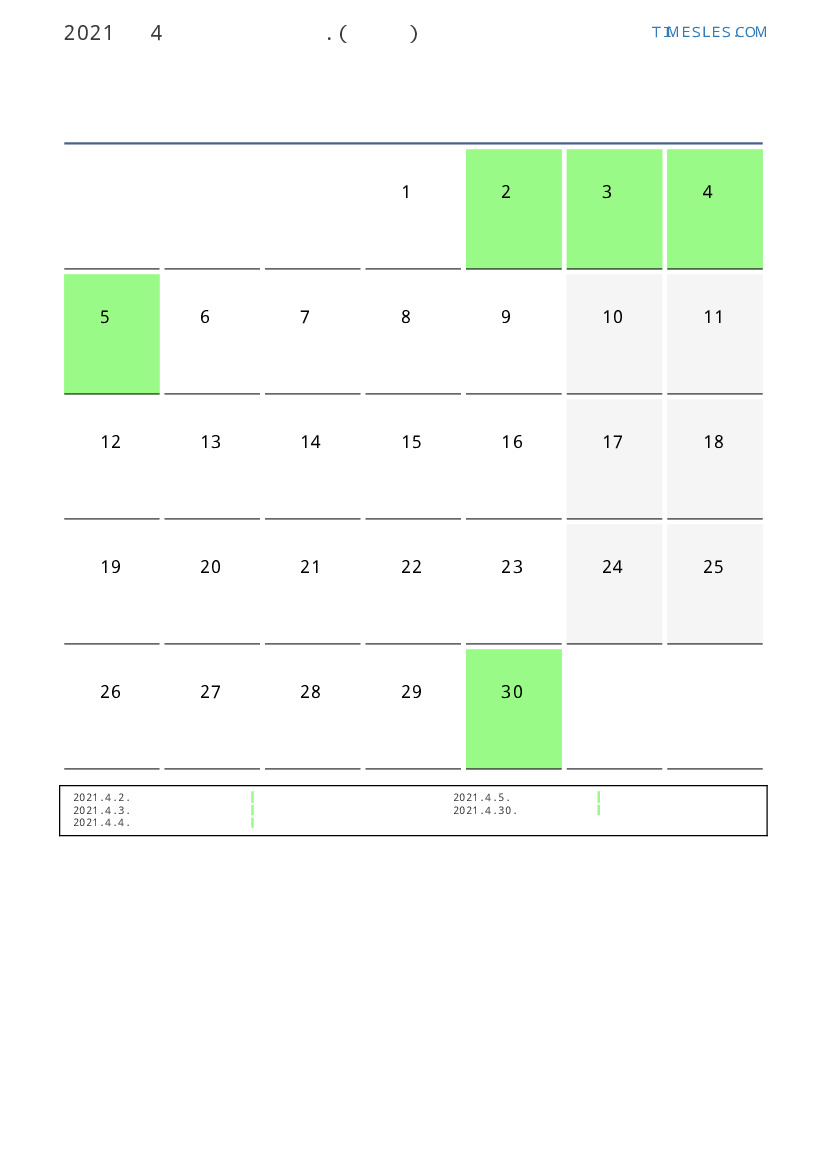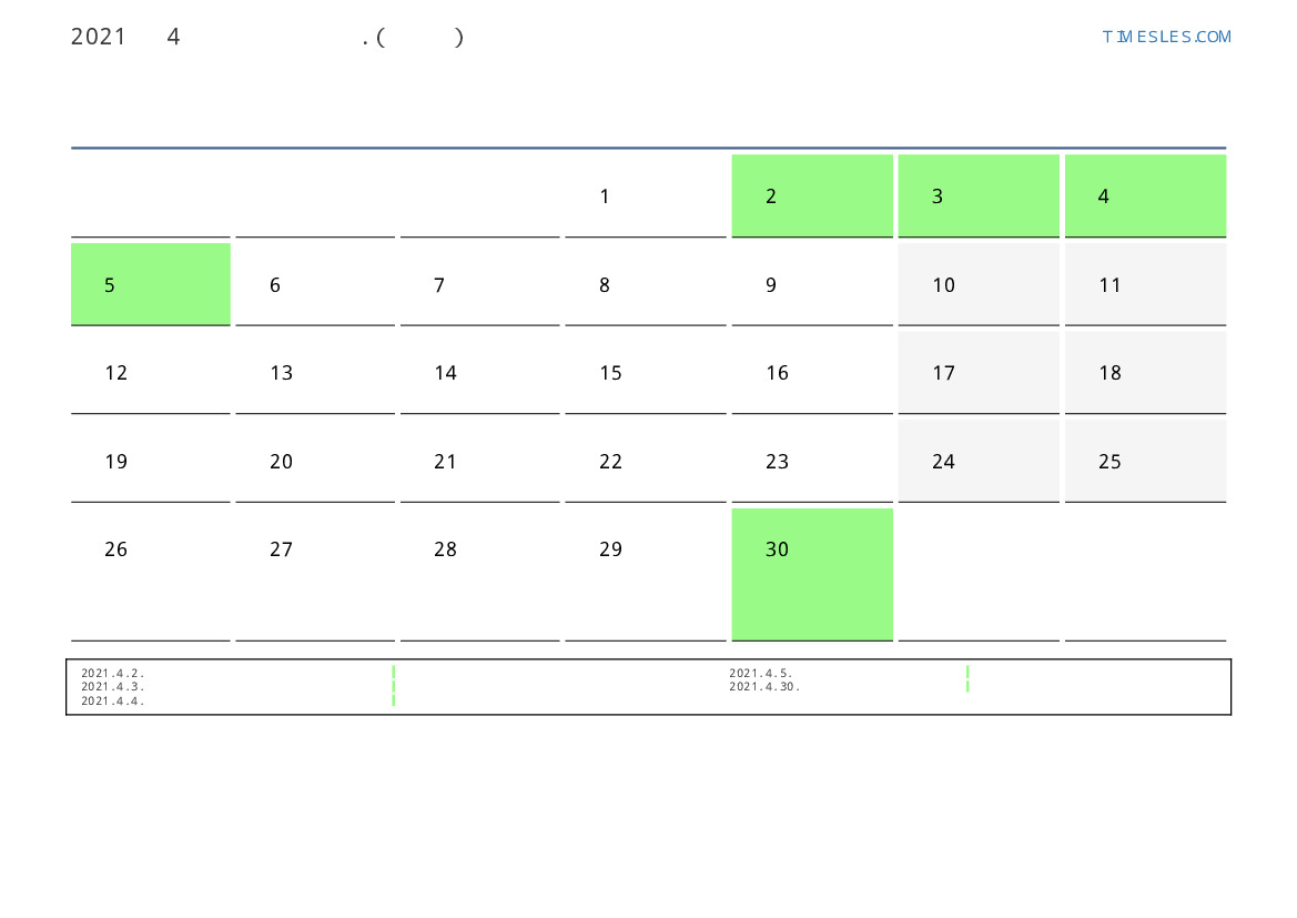 4월에는 30 일 포함됩니다. 이것은 2021 년 4 개월입니다. 올해의 계절 : 봄. 4월 목요일에 시작하여 금요일에 끝납니다. 2021년 4월에 스웨덴 5 공휴일 및 휴무 있습니다.
