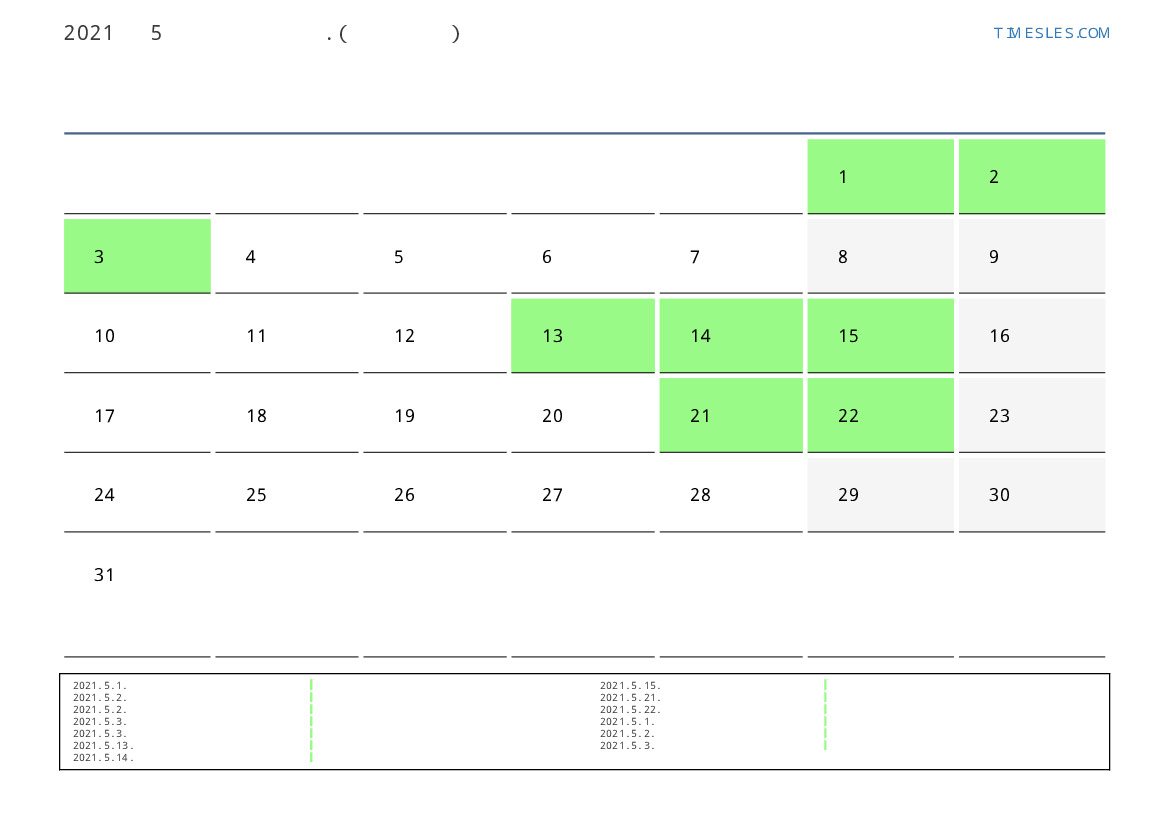 5월에는 31 일 포함됩니다. 이것은 2021 년 5 개월입니다. 올해의 계절 : 봄. 5월 토요일에 시작하여 월요일에 끝납니다. 2021년 5월에 몬테네그로 13 공휴일 및 휴무 있습니다.