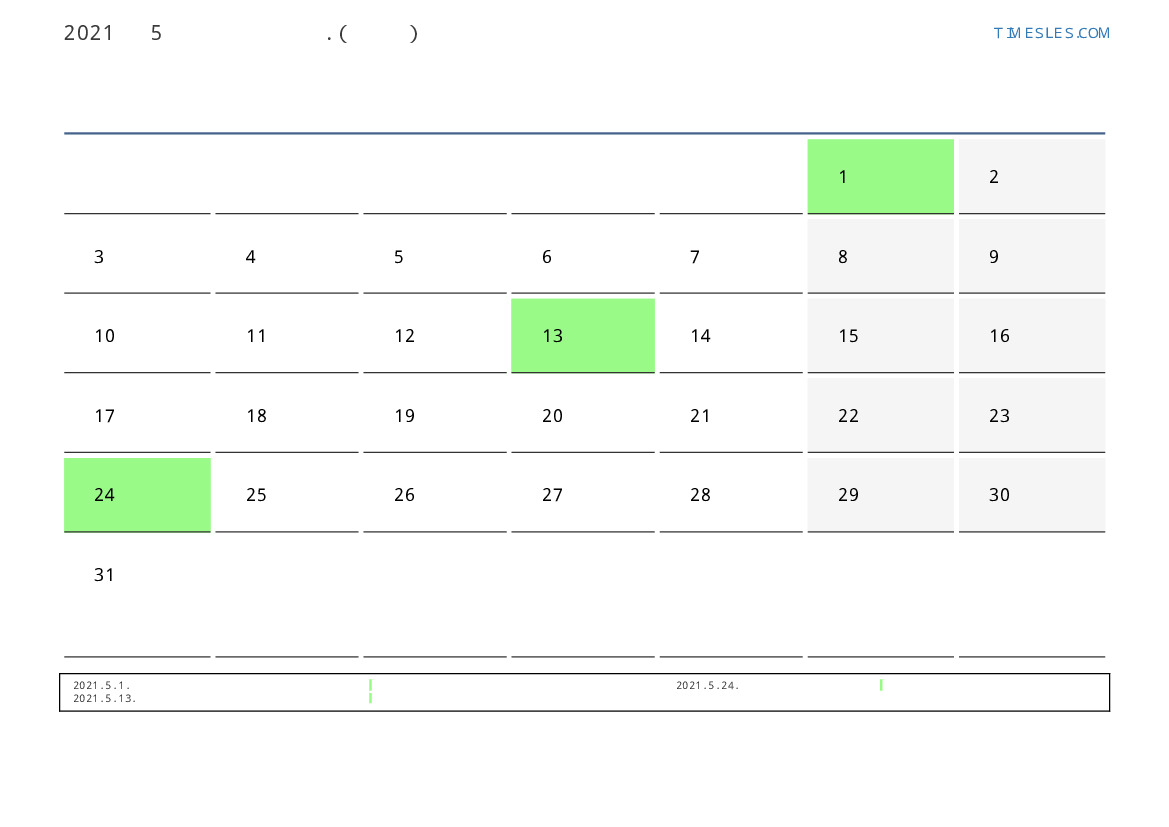 5월에는 31 일 포함됩니다. 이것은 2021 년 5 개월입니다. 올해의 계절 : 봄. 5월 토요일에 시작하여 월요일에 끝납니다. 2021년 5월에 스위스에서 4 공휴일 및 휴무 있습니다.