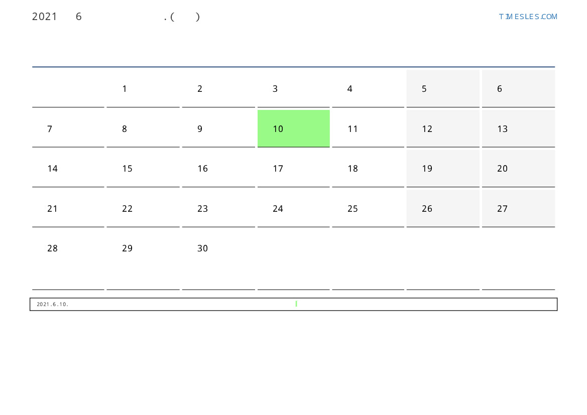 6월에는 30 일 포함됩니다. 이것은 2021 년 6 개월입니다. 올해의 계절 : 여름. 6월 화요일에 시작하여 수요일에 끝납니다. 2021년 6월에 콩고 3 공휴일 및 휴무 있습니다.