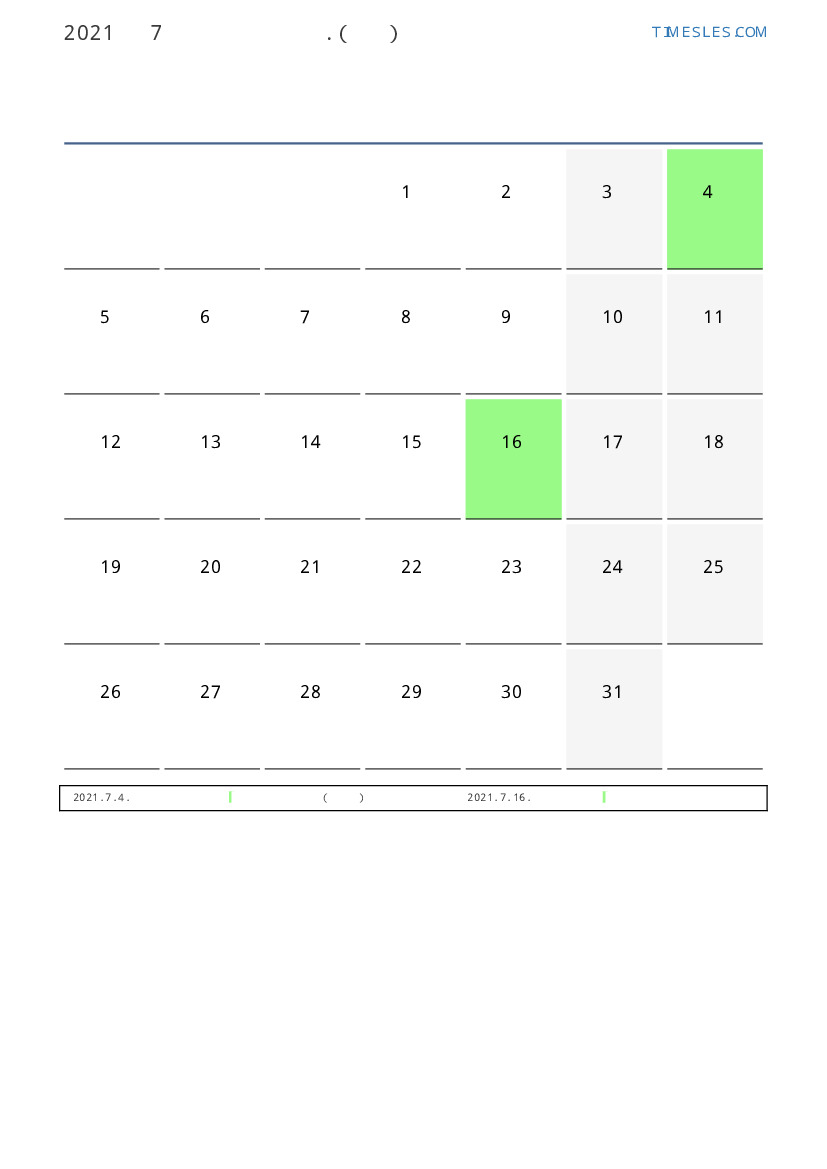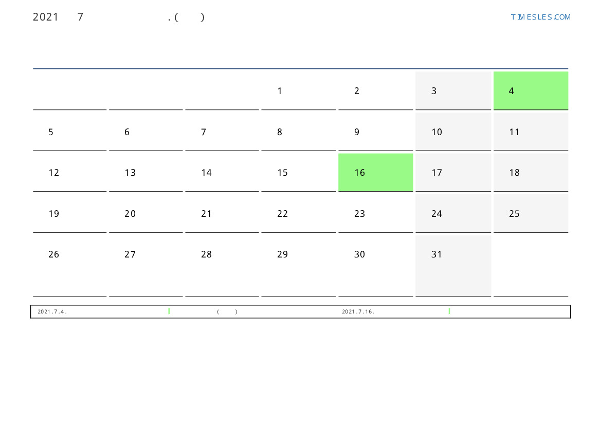 칠레 2021 년 7월 월 공휴일 및 주말 달력