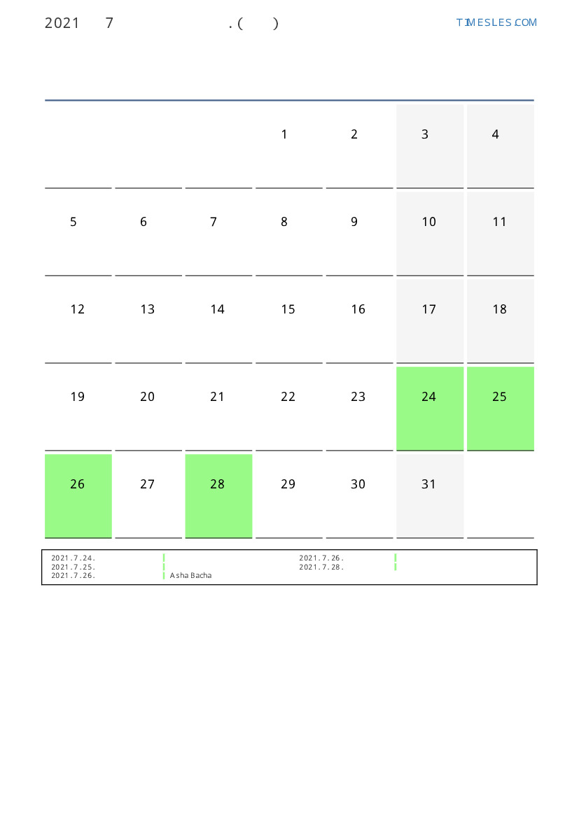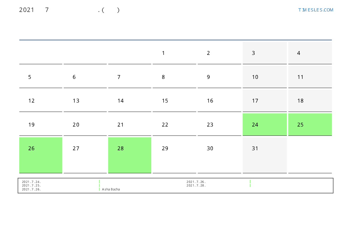 태국 2021 년 7월 월 공휴일 및 주말 달력