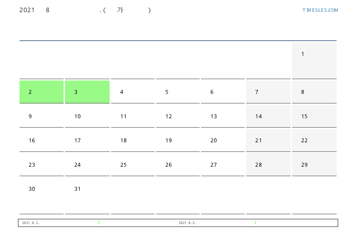 한 달 동안 휴일이없는 풍경 달력