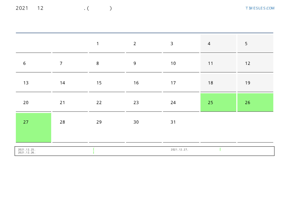12월에는 31 일 포함됩니다. 이것은 2021 년 12 개월입니다. 올해의 계절 : 겨울. 12월 수요일에 시작하여 금요일에 끝납니다. 2021년 12월에 보츠와나 4 공휴일 및 휴무 있습니다.