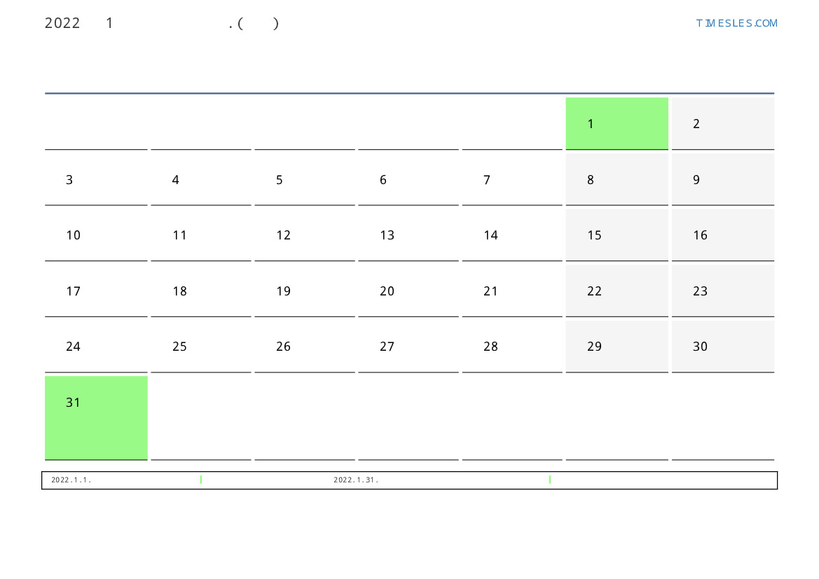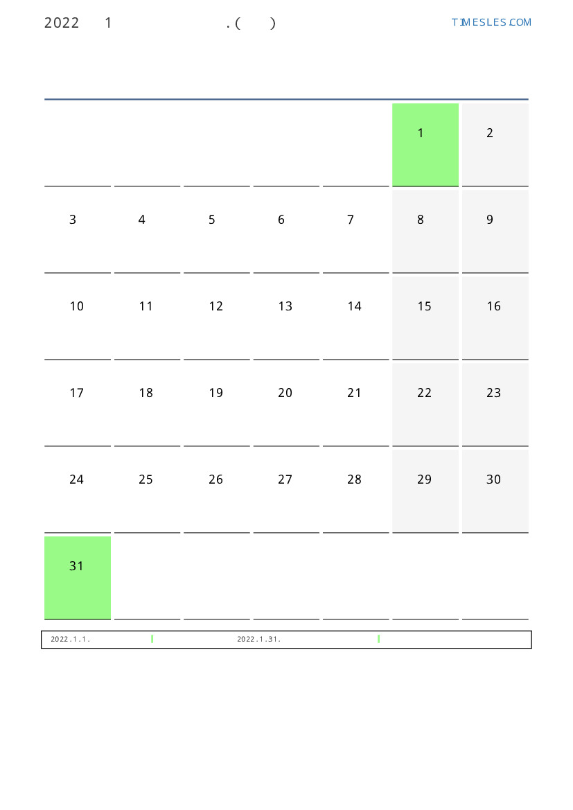 중국 2022 년 1월 월 공휴일 및 주말 달력
