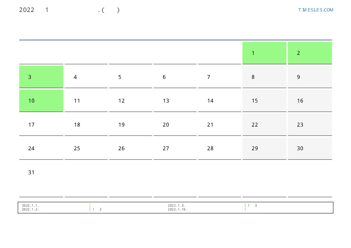 1월에는 31 일 포함됩니다. 이것은 2022 년 1 개월입니다. 올해의 계절 : 겨울. 1월 토요일에 시작하여 월요일에 끝납니다. 2022년 1월에 일본에서 4 공휴일 및 휴무 있습니다.