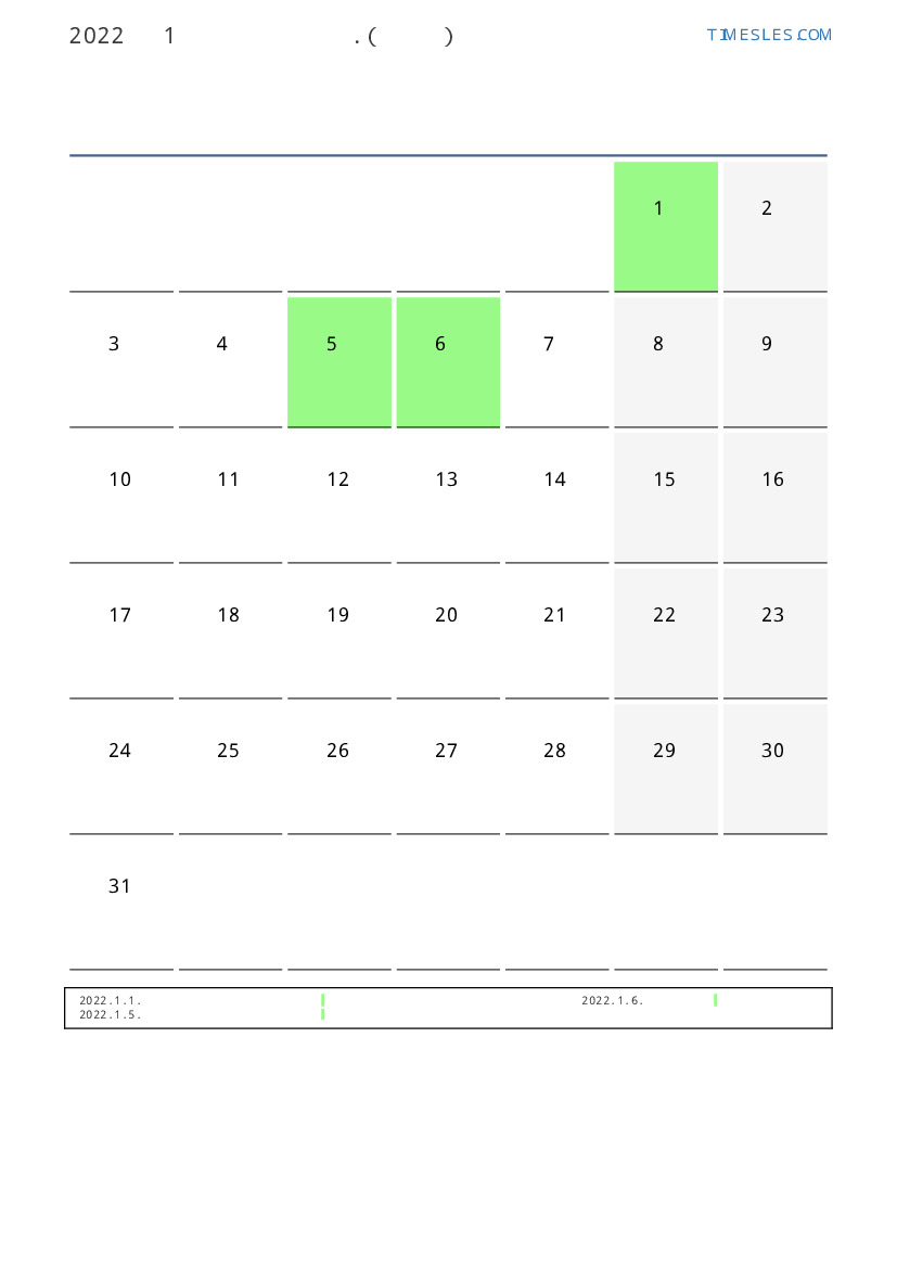 스웨덴 2022 년 1월 월 공휴일 및 주말 달력