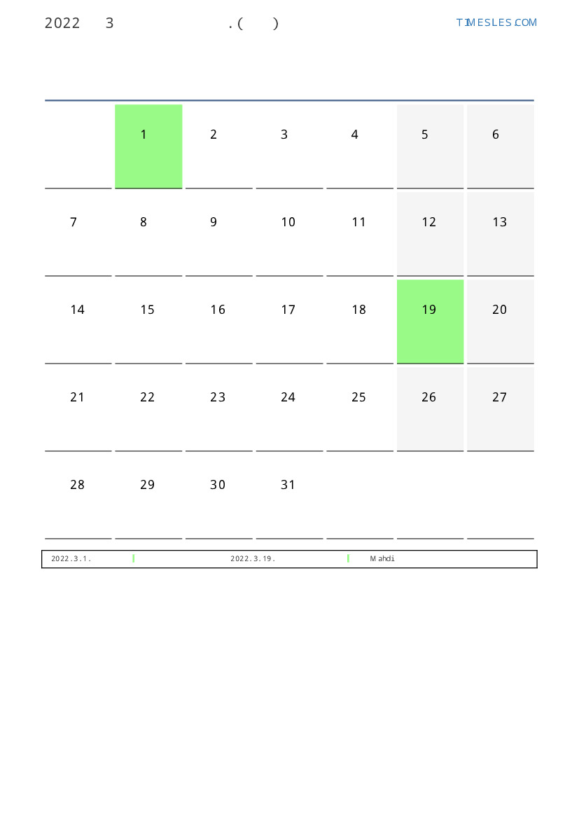 이란 용 2022 년 3월 월 공휴일 및 주말이 포함 된 PDF 캘린더 다운로드 및 인쇄
