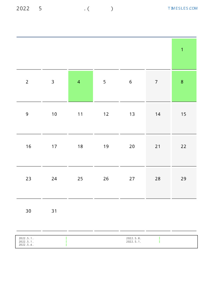 5월에는 31 일 포함됩니다. 이것은 2022 년 5 개월입니다. 올해의 계절 : 봄. 5월 일요일에 시작하여 화요일에 끝납니다. 2022년 5월에 라트비아 5 공휴일 및 휴무 있습니다.