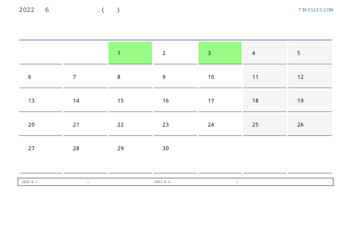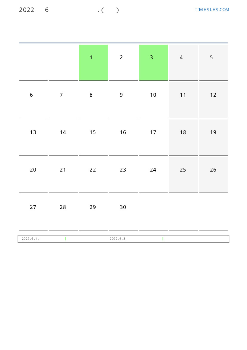 중국 2022 년 6월 월 공휴일 및 주말 달력