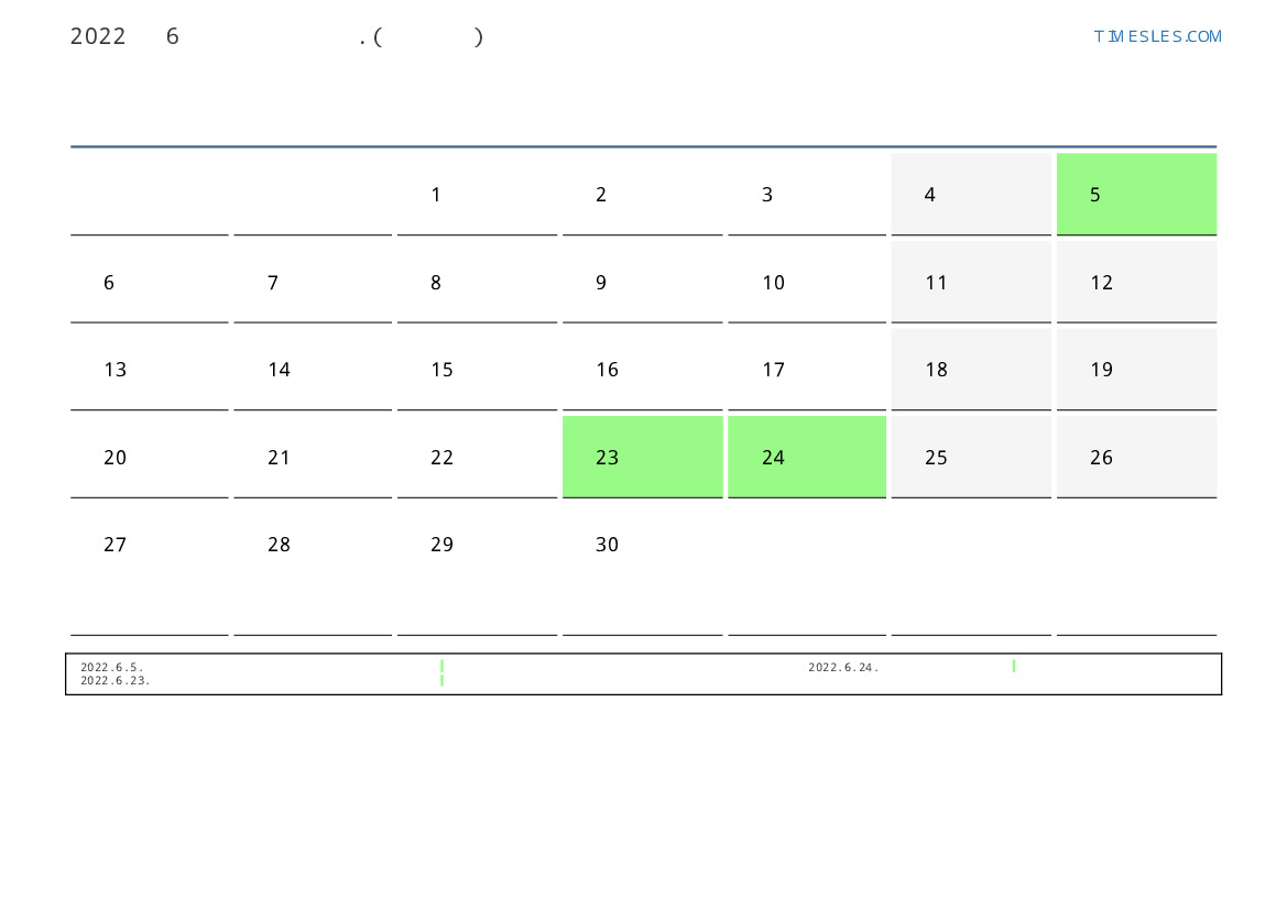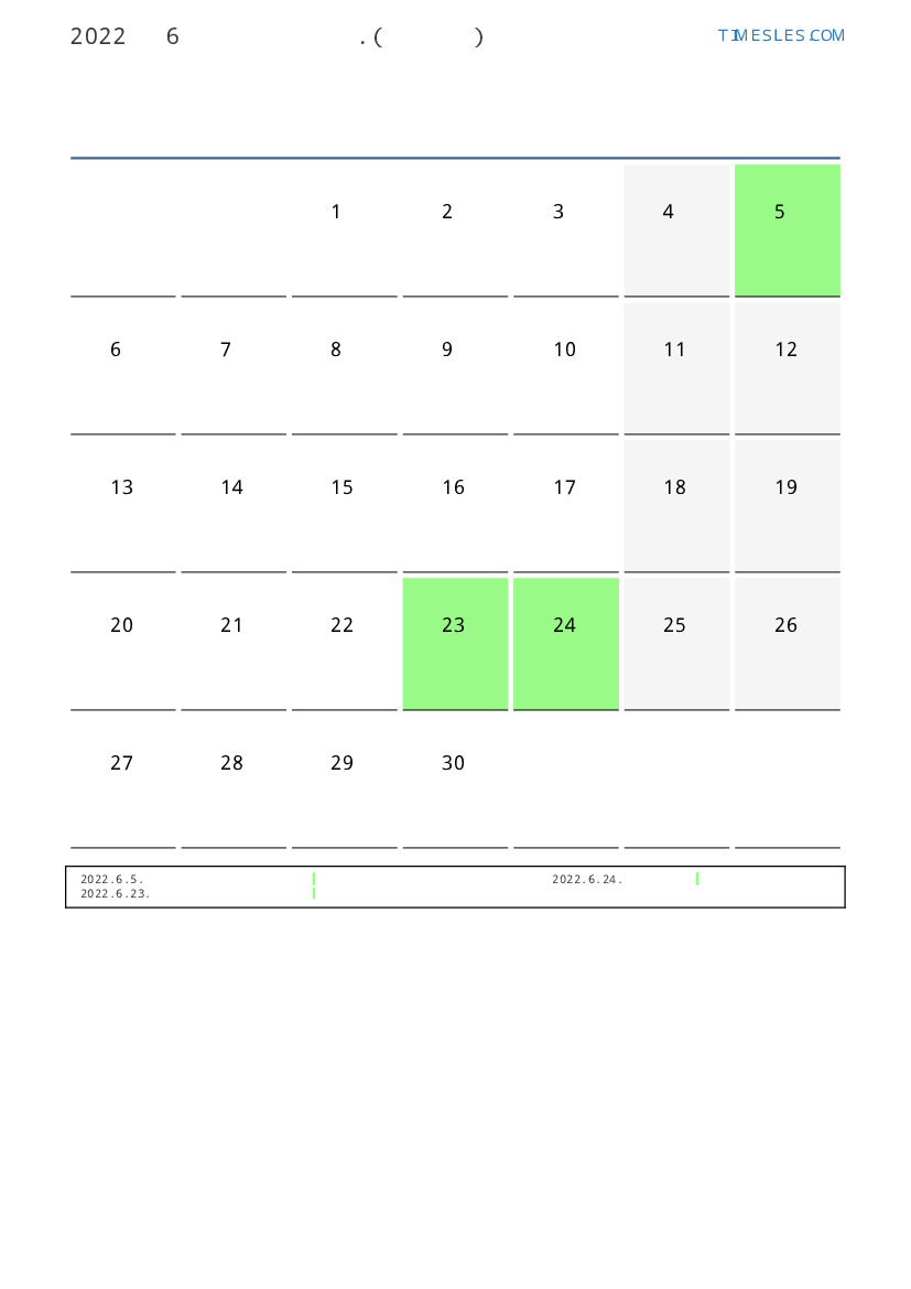6월에는 30 일 포함됩니다. 이것은 2022 년 6 개월입니다. 올해의 계절 : 여름. 6월 수요일에 시작하여 목요일에 끝납니다. 2022년 6월에 라트비아 4 공휴일 및 휴무 있습니다.