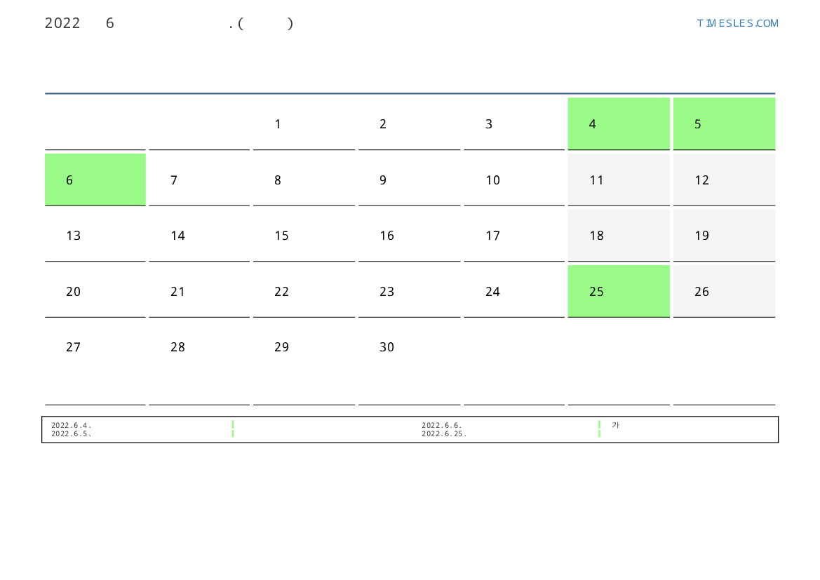 6월에는 30 일 포함됩니다. 이것은 2022 년 6 개월입니다. 올해의 계절 : 여름. 6월 수요일에 시작하여 목요일에 끝납니다. 2022년 6월에 스웨덴 6 공휴일 및 휴무 있습니다.