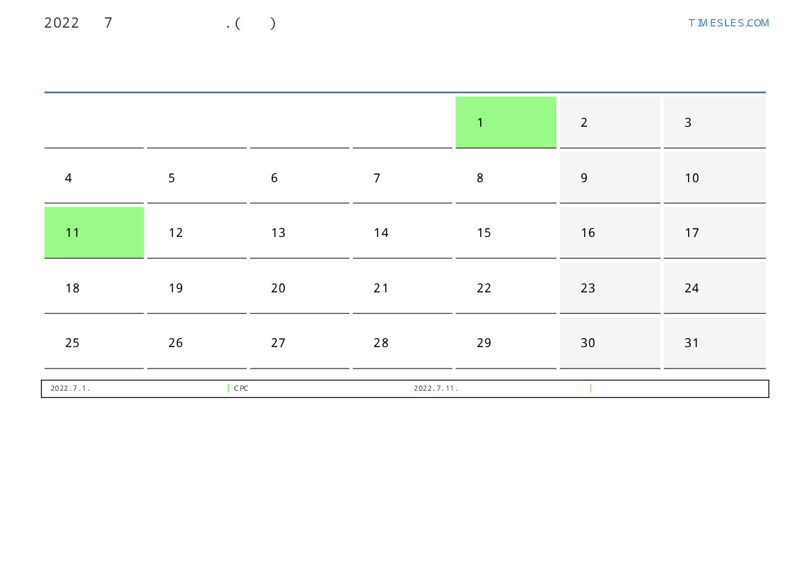 중국 2022 년 7월 월 공휴일 및 주말 달력