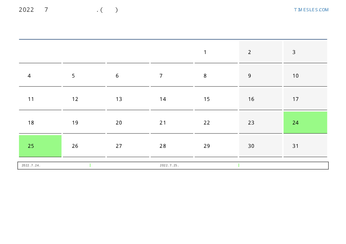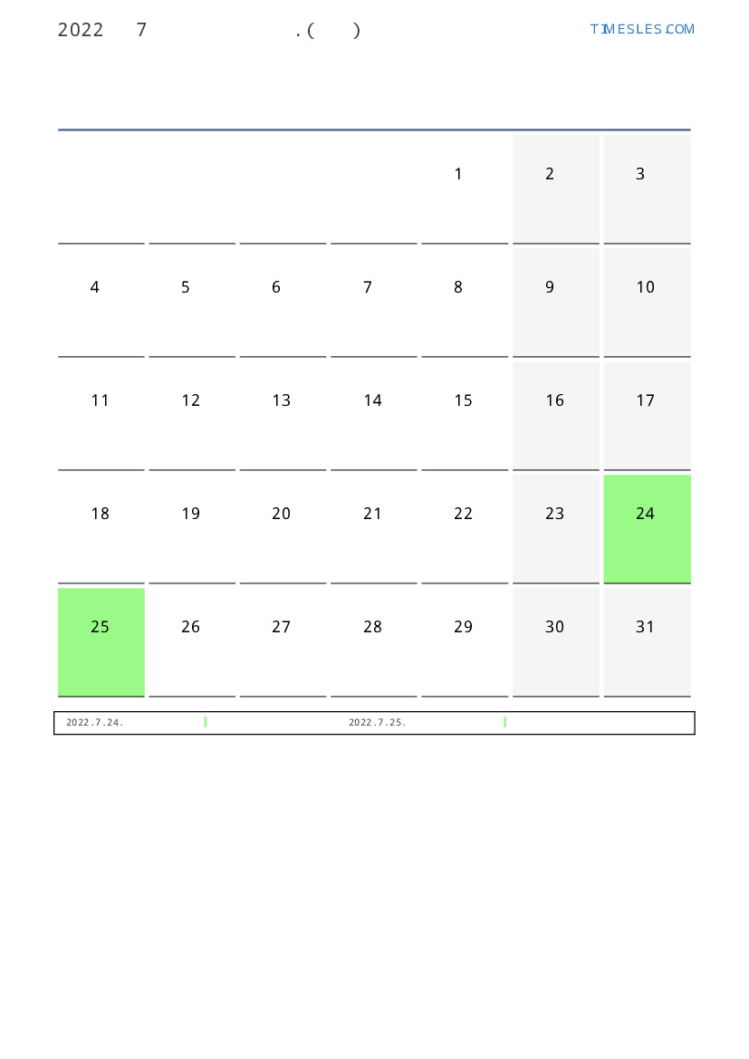 미국 2022 년 7월 월 공휴일 및 주말 달력