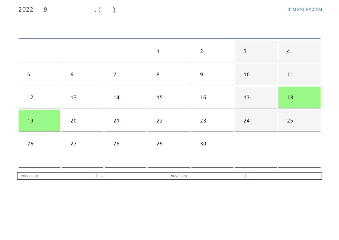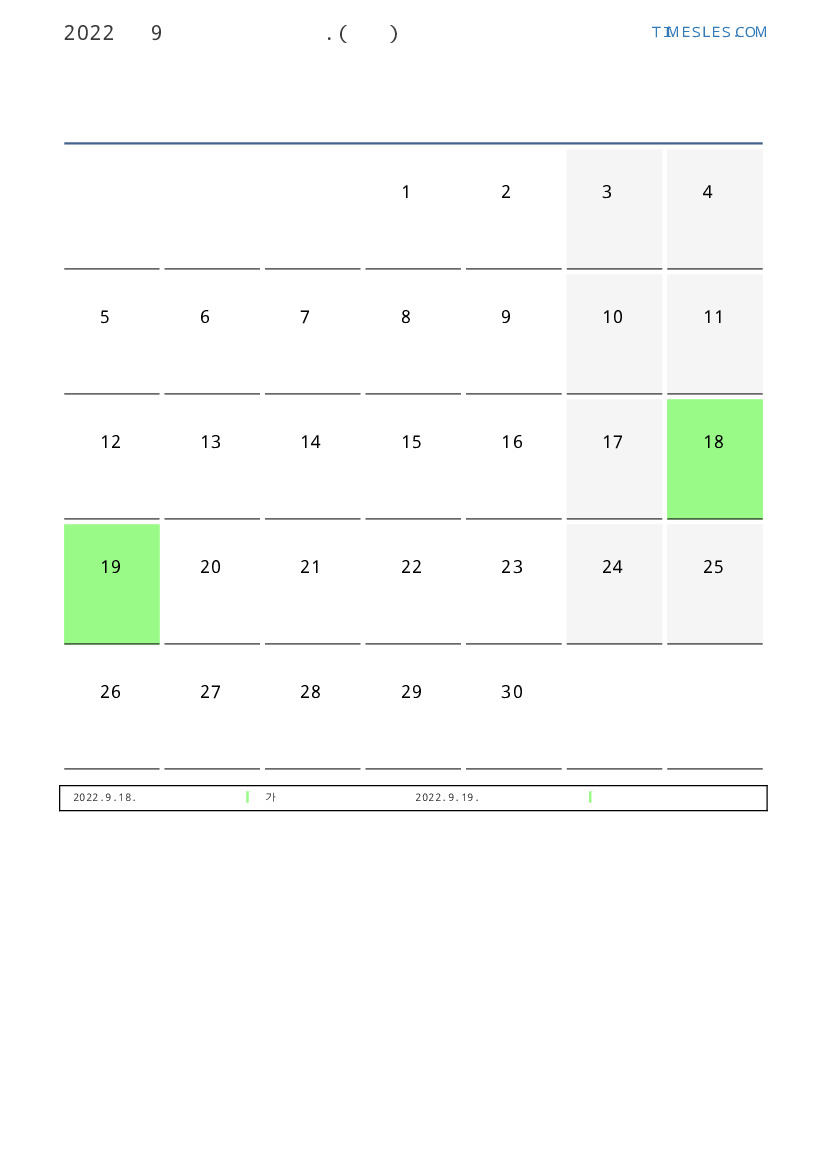 칠레 2022 년 9월 월 공휴일 및 주말 달력
