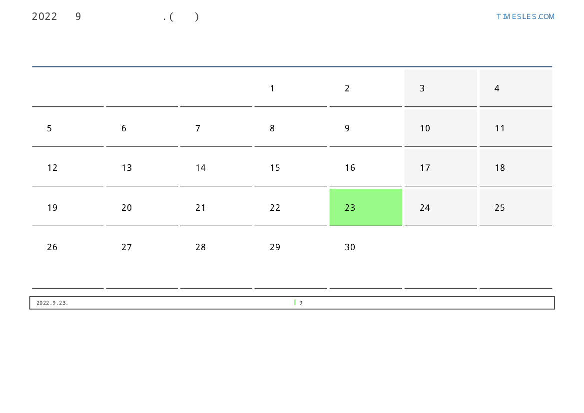 9월에는 30 일 포함됩니다. 이것은 2022 년 9 개월입니다. 올해의 계절 : 가을. 9월 목요일에 시작하여 금요일에 끝납니다. 2022년 9월에 콩고 1 공휴일 및 휴무 있습니다.