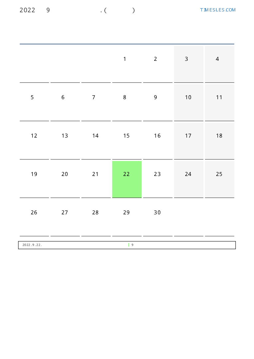 9월에는 30 일 포함됩니다. 이것은 2022 년 9 개월입니다. 올해의 계절 : 가을. 9월 목요일에 시작하여 금요일에 끝납니다. 2022년 9월에 에콰도르 1 공휴일 및 휴무 있습니다.