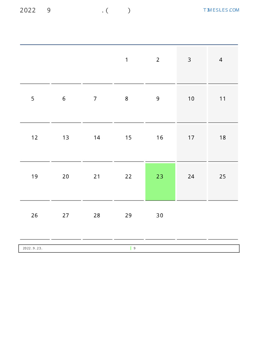 9월에는 30 일 포함됩니다. 이것은 2022 년 9 개월입니다. 올해의 계절 : 가을. 9월 목요일에 시작하여 금요일에 끝납니다. 2022년 9월에 투발루 1 공휴일 및 휴무 있습니다.