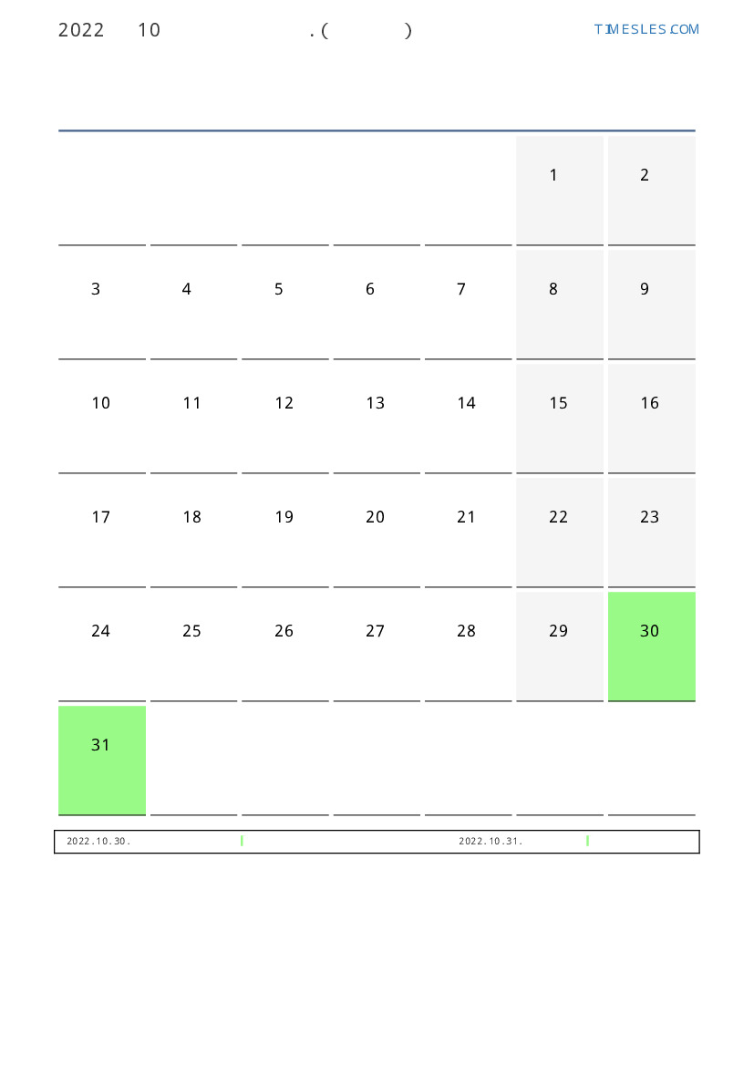 10월에는 31 일 포함됩니다. 이것은 2022 년 10 개월입니다. 올해의 계절 : 가을. 10월 토요일에 시작하여 월요일에 끝납니다. 2022년 10월에 알바니 2 공휴일 및 휴무 있습니다.