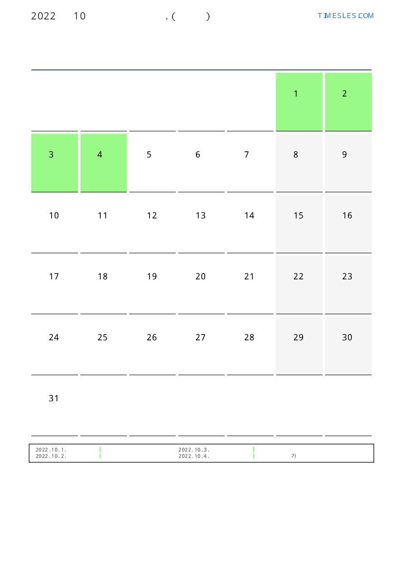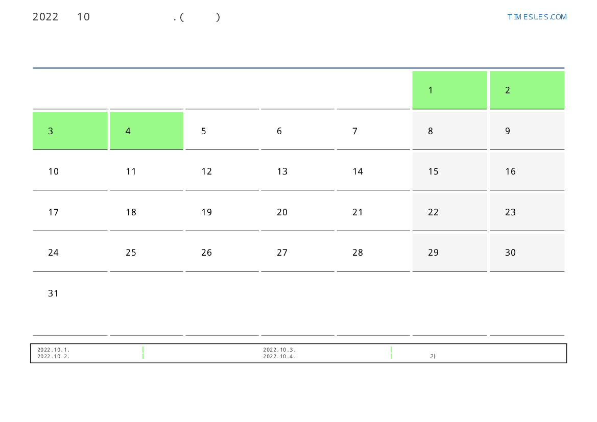 투발루 2022 년 10월 월 공휴일 및 주말 달력