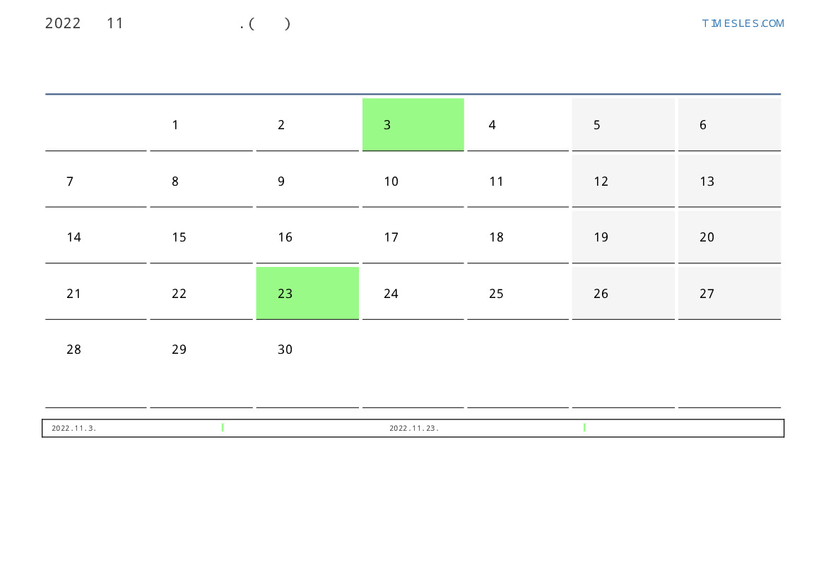 일본 2022 년 11월 월 공휴일 및 주말 달력