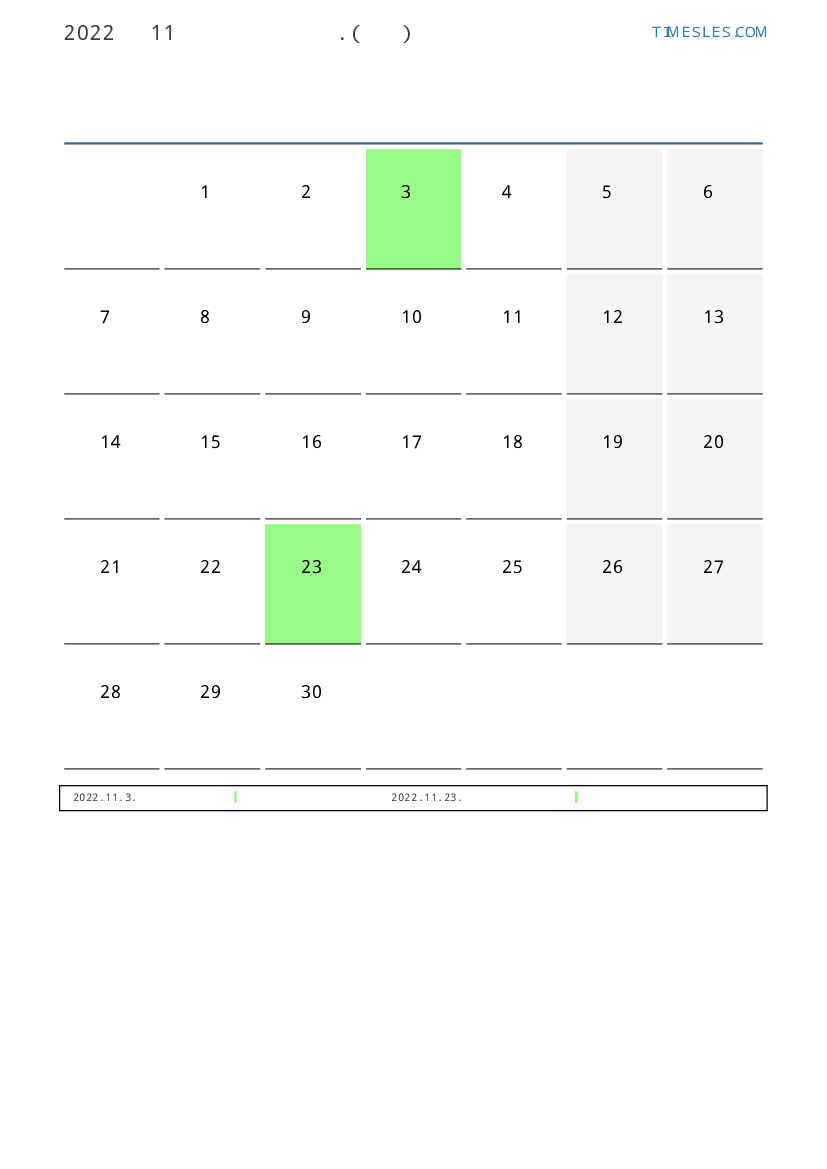 11월에는 30 일 포함됩니다. 이것은 2022 년 11 개월입니다. 올해의 계절 : 가을. 11월 화요일에 시작하여 수요일에 끝납니다. 2022년 11월에 일본에서 3 공휴일 및 휴무 있습니다.