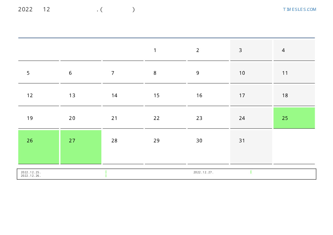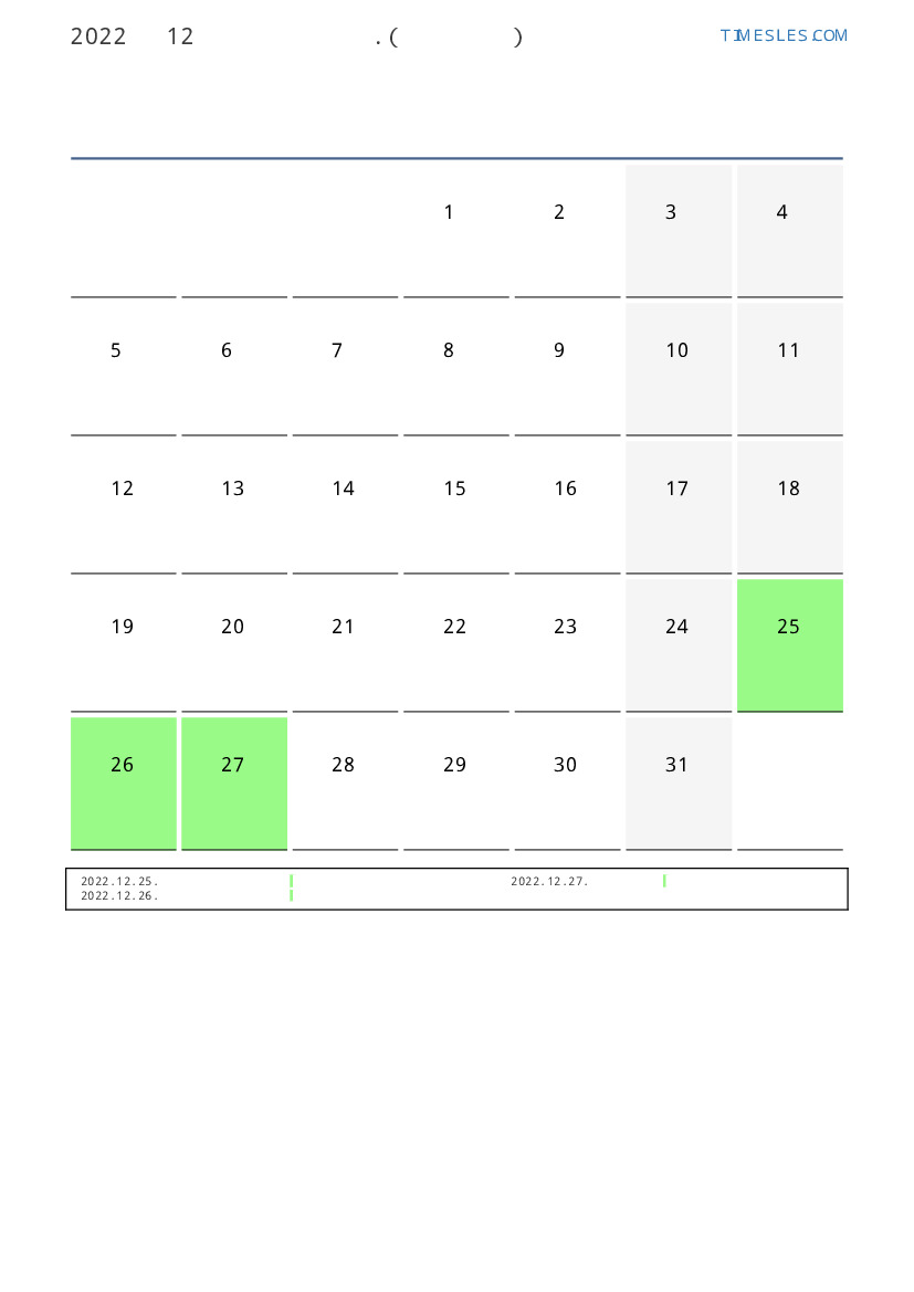 바베이도스 2022 년 12월 월 공휴일 및 주말 달력