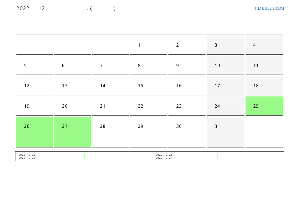 보츠와나 2022 년 12월 월 공휴일 및 주말 달력