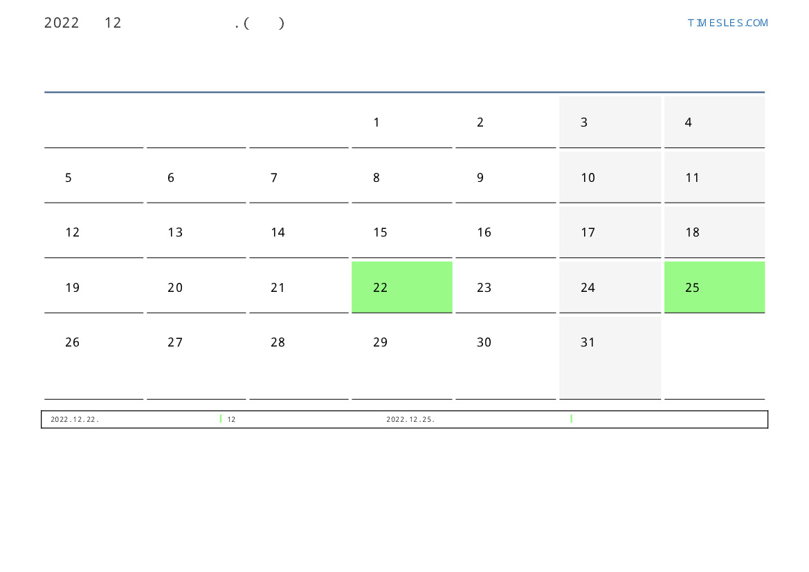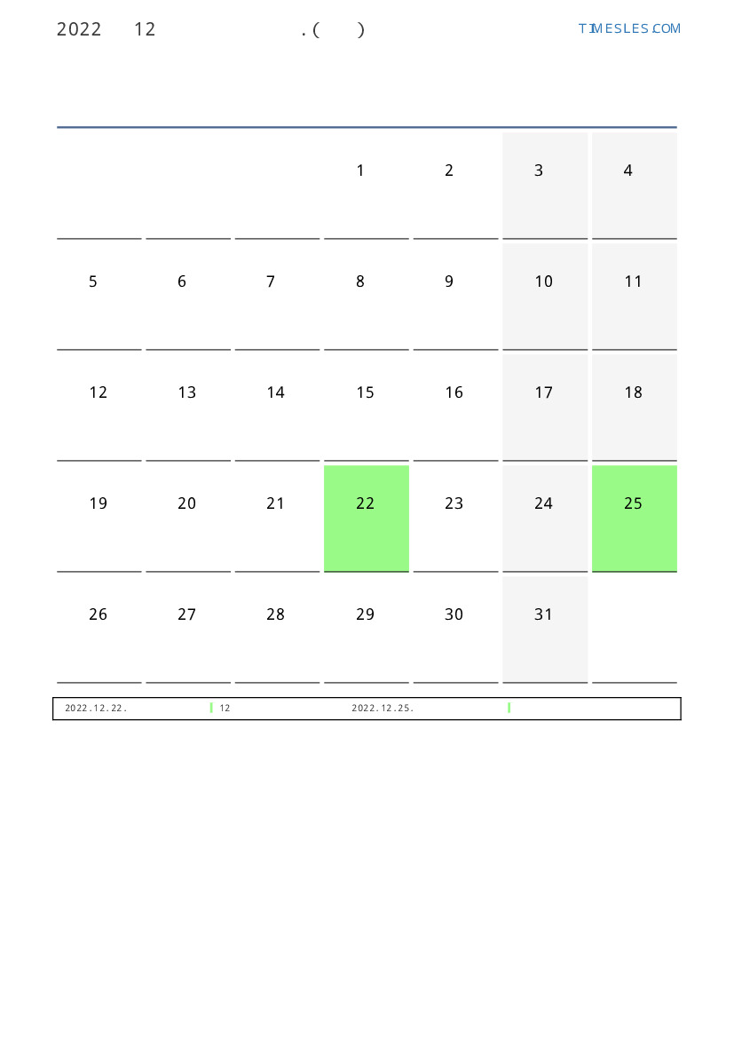 중국 2022 년 12월 월 공휴일 및 주말 달력