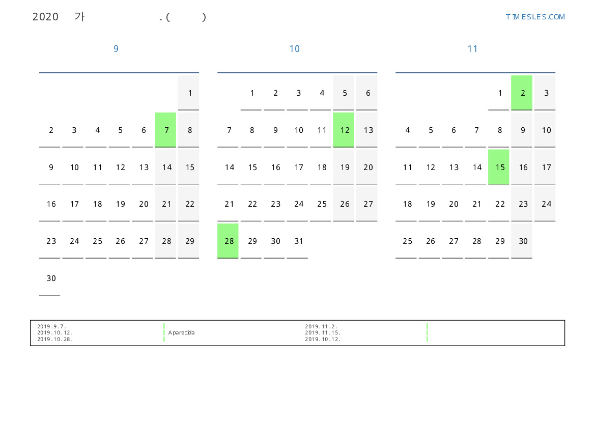 브라질 2019 년 가을을 위해 공휴일 및 주말 달력