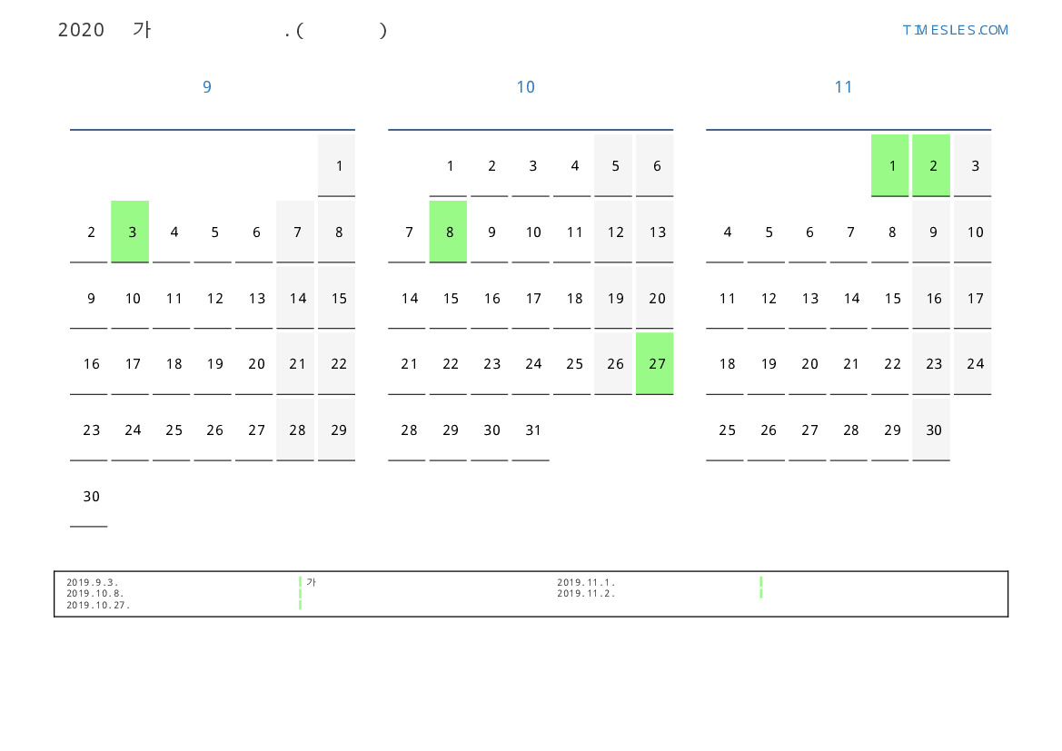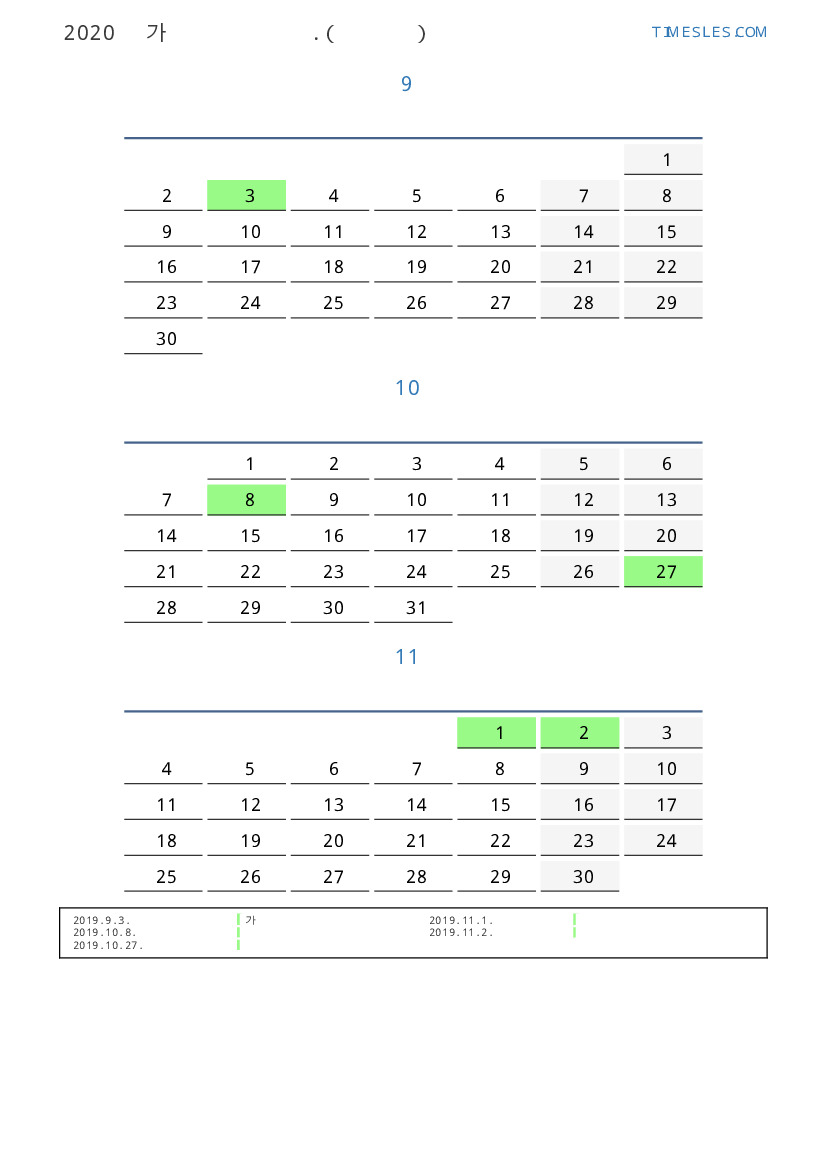 연휴가있는 계절별 세로 달력
