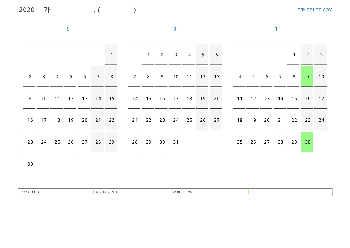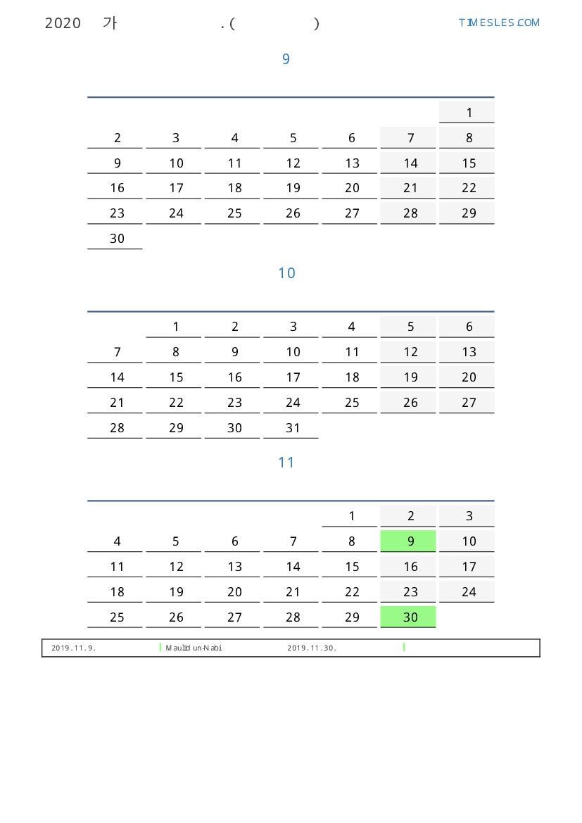필리핀 2019 년 가을을 위해 공휴일 및 주말이 포함 된 PDF 캘린더 다운로드 및 인쇄