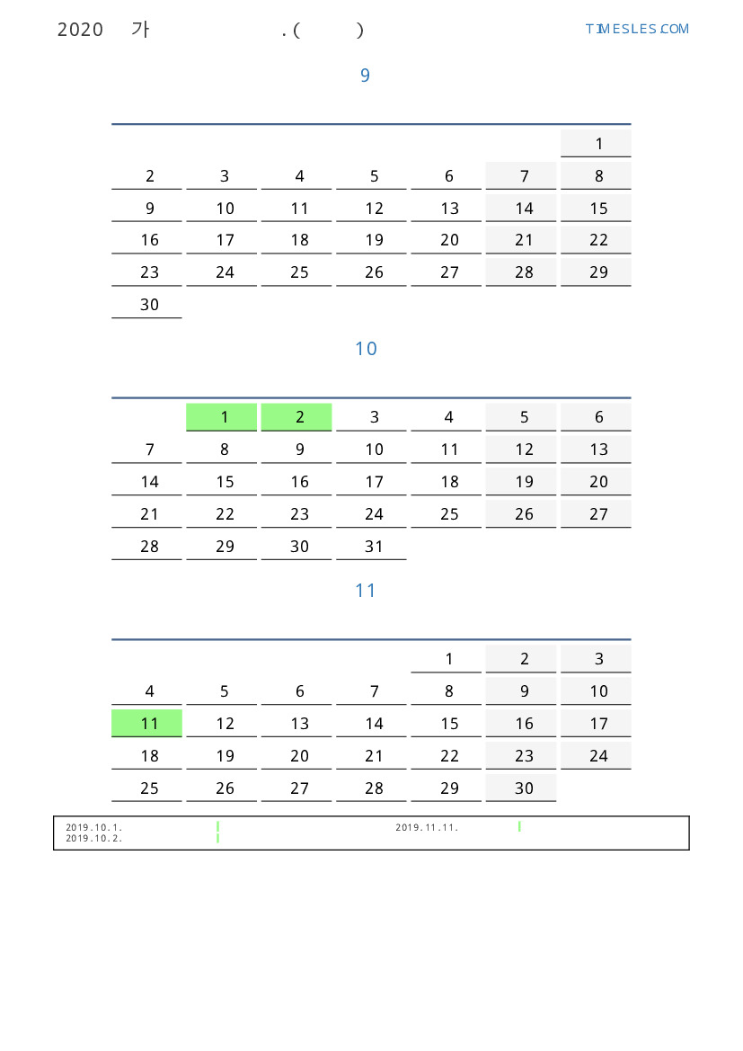 투발루 2019 년 가을을 위해 공휴일 및 주말이 포함 된 PDF 캘린더 다운로드 및 인쇄
