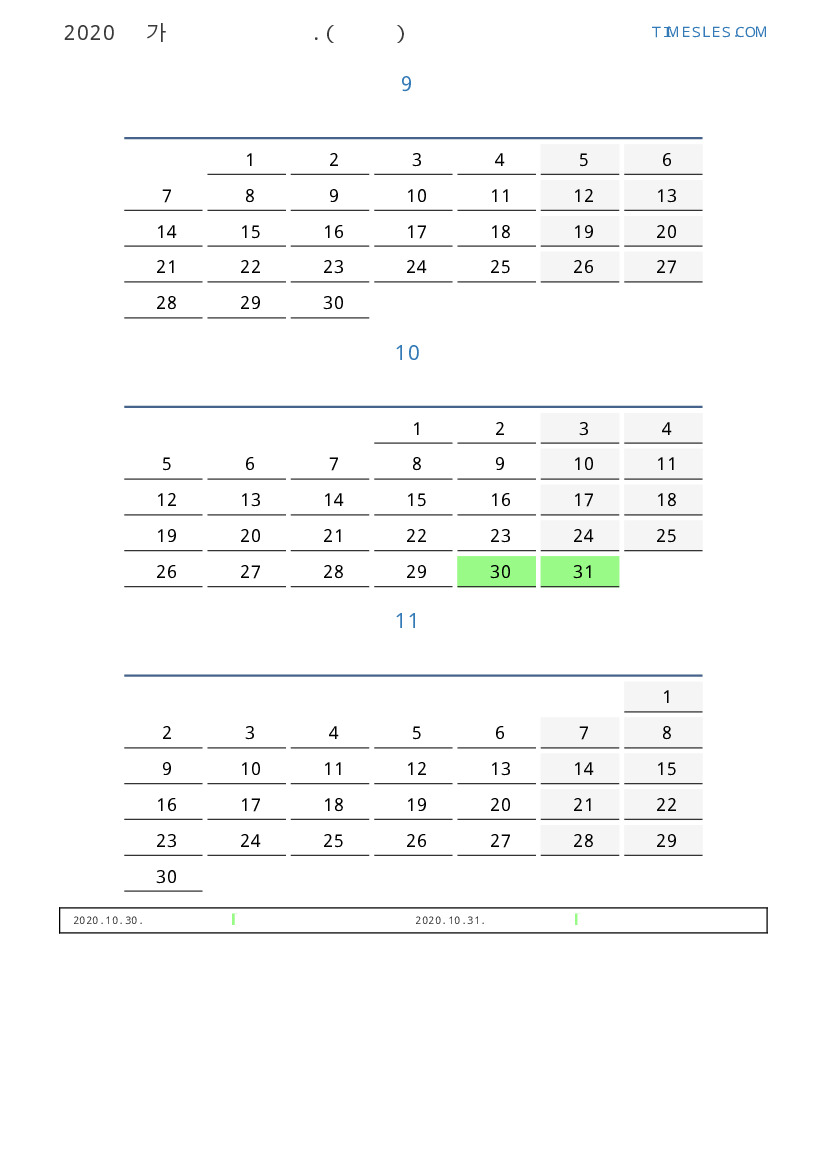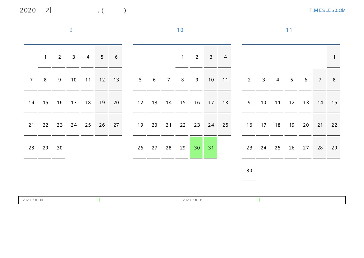 스웨덴 2020 년 가을을 위해 공휴일 및 주말이 포함 된 PDF 캘린더 다운로드 및 인쇄