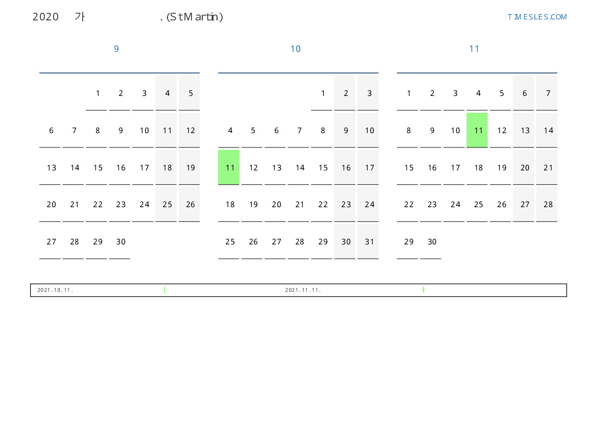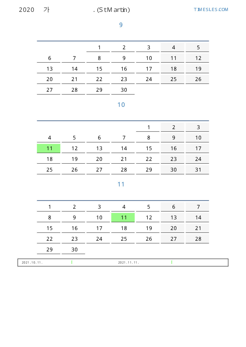 신트 마르 턴 2021 년 가을을 위해 달력