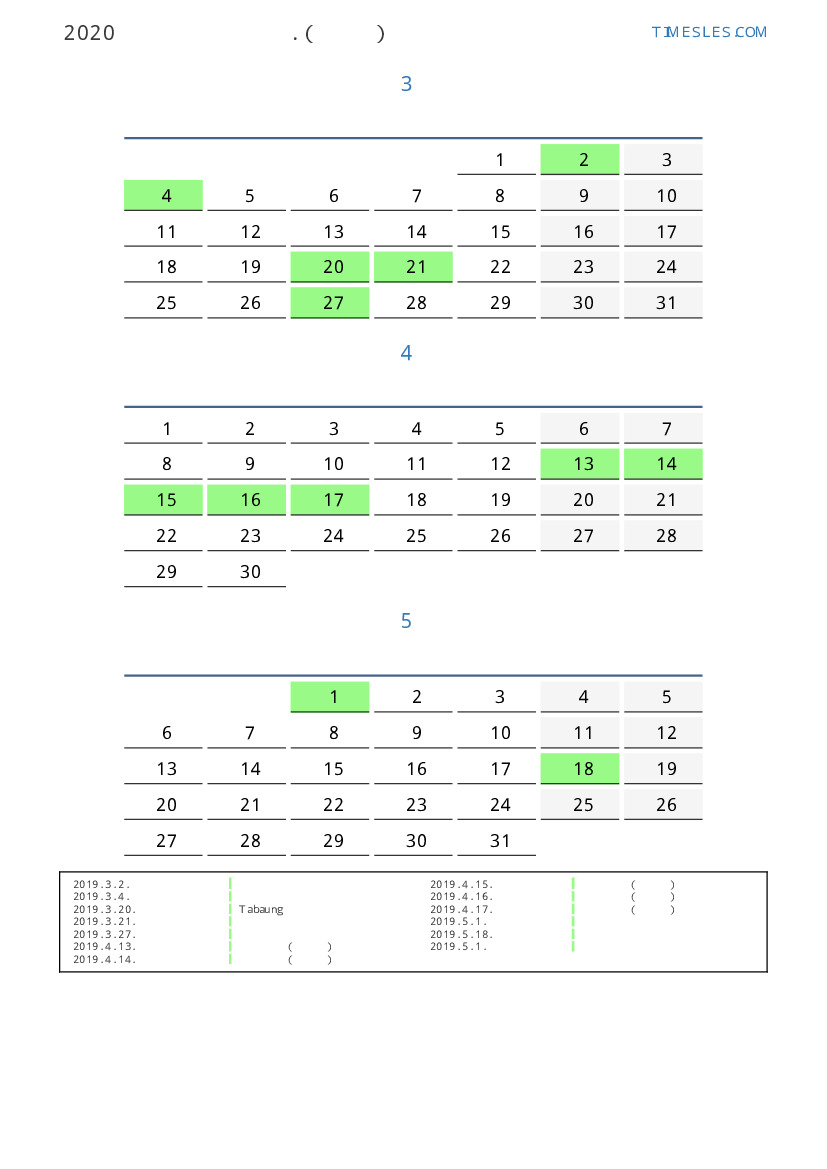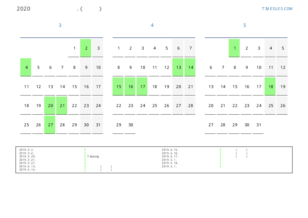 미얀마 2019 년 봄을 위해 공휴일 및 주말이 포함 된 PDF 캘린더 다운로드 및 인쇄